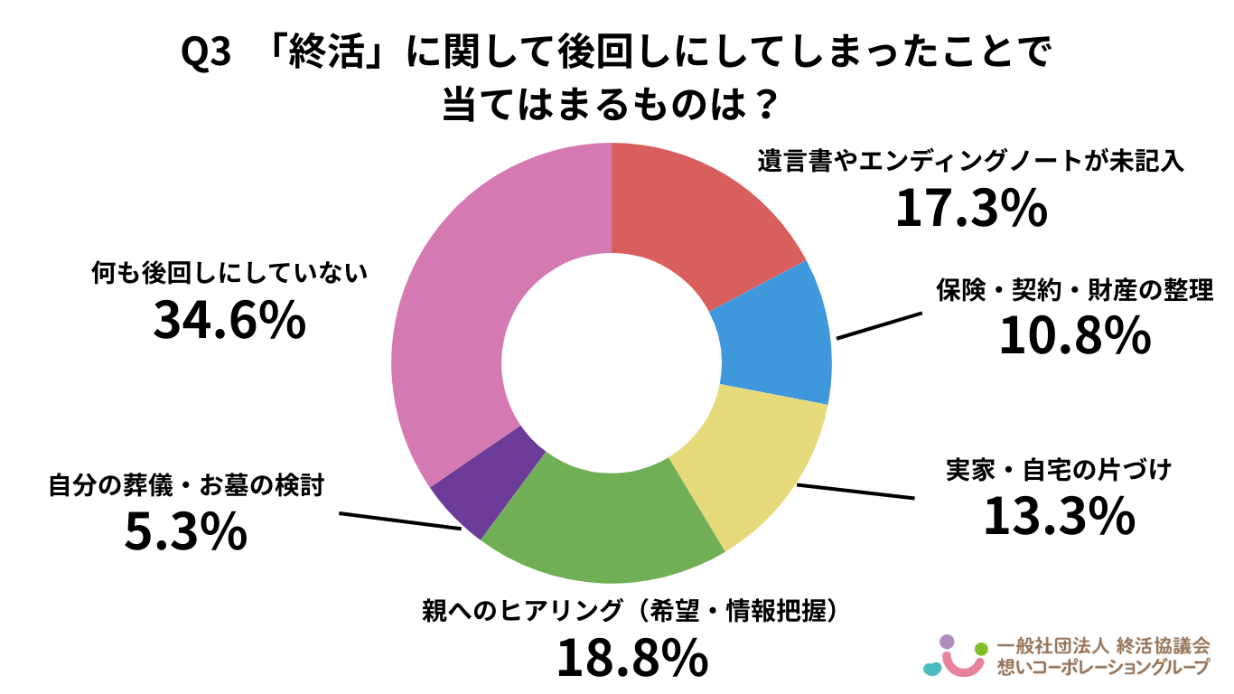 Q3では「何も後回しにしていない」が34.6%で最多となったものの、「親へのヒアリング(18.8%)」や「遺言書・エンディングノートの未記入(17.3%)」など、家族間の意思確認や情報整理が進んでいない層も一定数存在することがうかがえます。