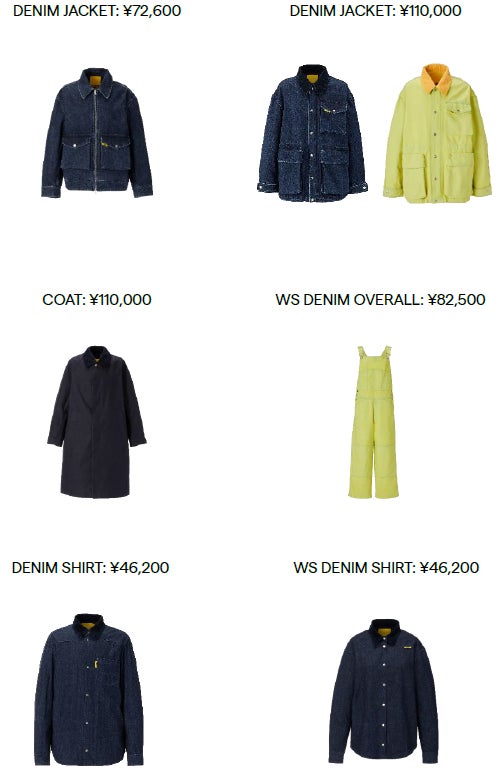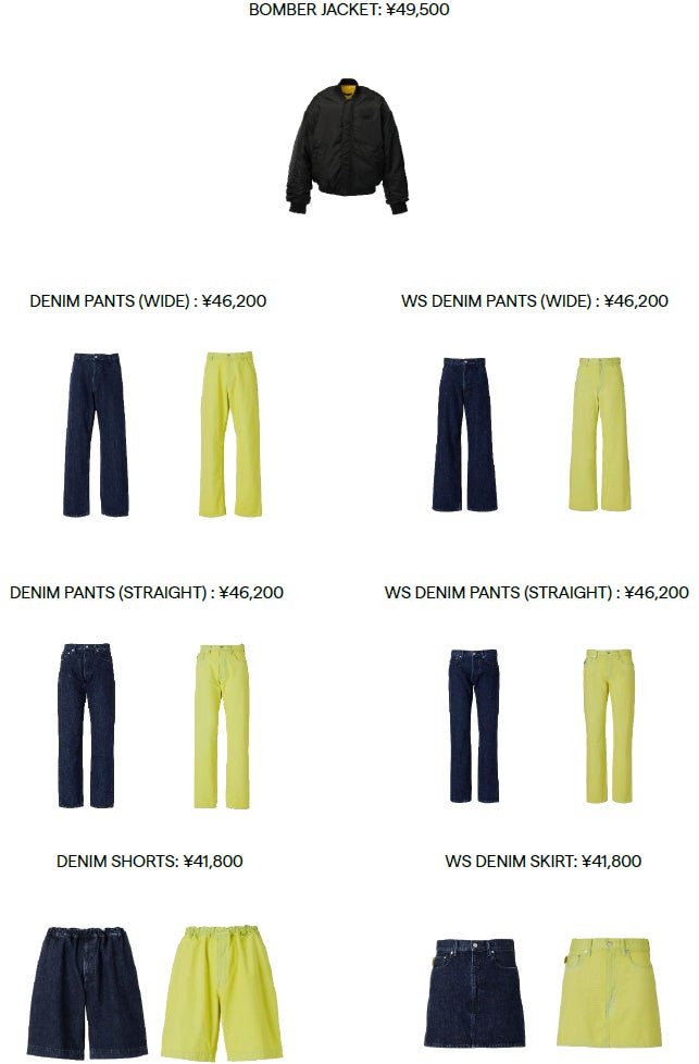 シリーズには、ストレートやワイドシルエットのパンツをはじめ、スカートやジャケットなど複数のデニムアイテムが揃います。特に、ブランドのアイコンカラーでもあるイエローのデニムアイテムは、ベースとなるインディゴブルーの生地を丁寧にブリーチしたのち、イエローの染料でオーバーダイしています。このプロセスにより、インディゴブルーの深みを残しつつ、イエローが際立つ独特な色合いを表現しています。