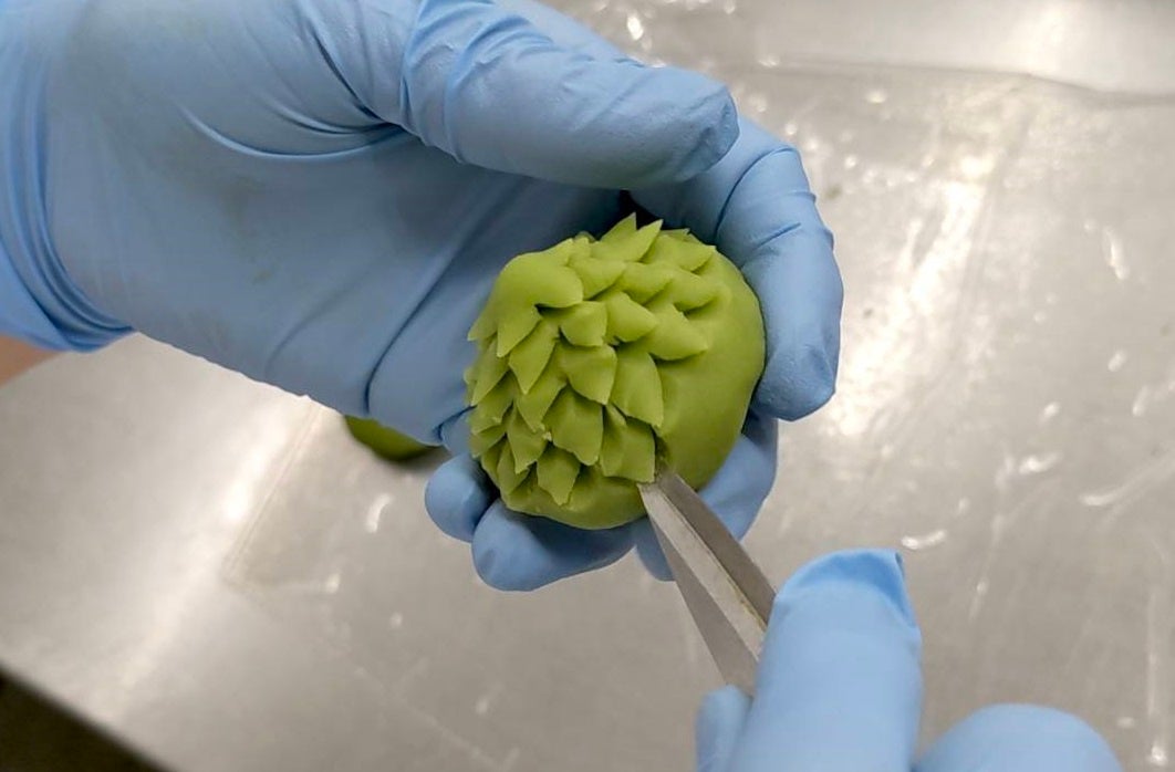 赤色の練り切り餡でこし餡を包みました。職人が1つ1つ丁寧に形を整えていきます。羊羹の緑の葉などを付けて、最後に3色(青、ピンク、黄)の寒天をのせました。