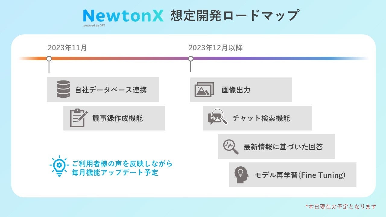 2023年9月1日より開始した無償トライアルに多くのお申し込みを頂き、多くのご意見を頂きました。安心安全にChatGPTを使用できる独自アプリケーションで、皆様の会社に業務改革を起こし、成長に寄与することを目的として、今後も引き続き、皆様のニーズに応える機能追加・バージョンアップを行います。(下図参照)