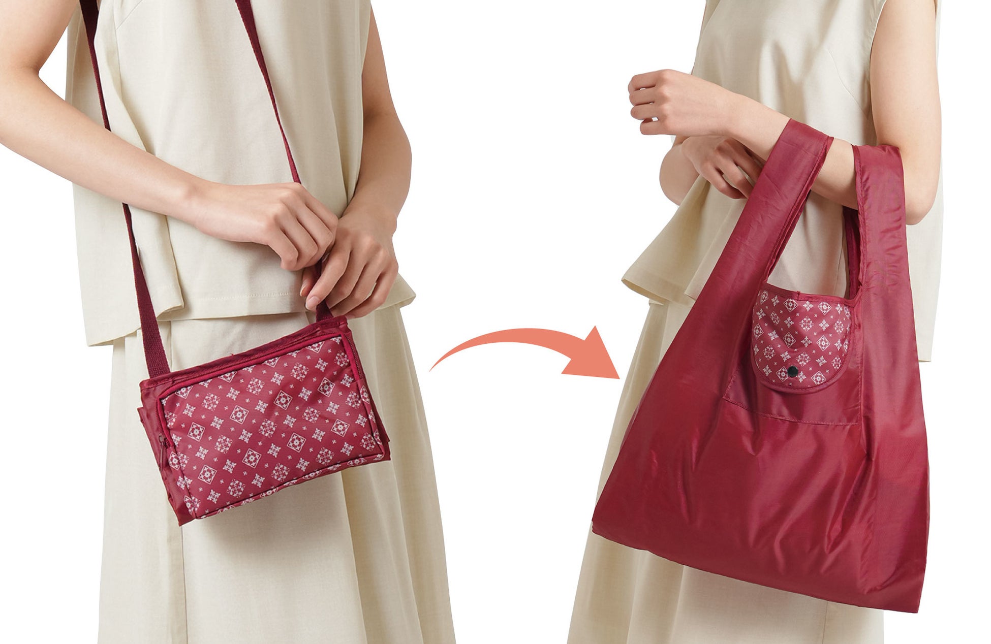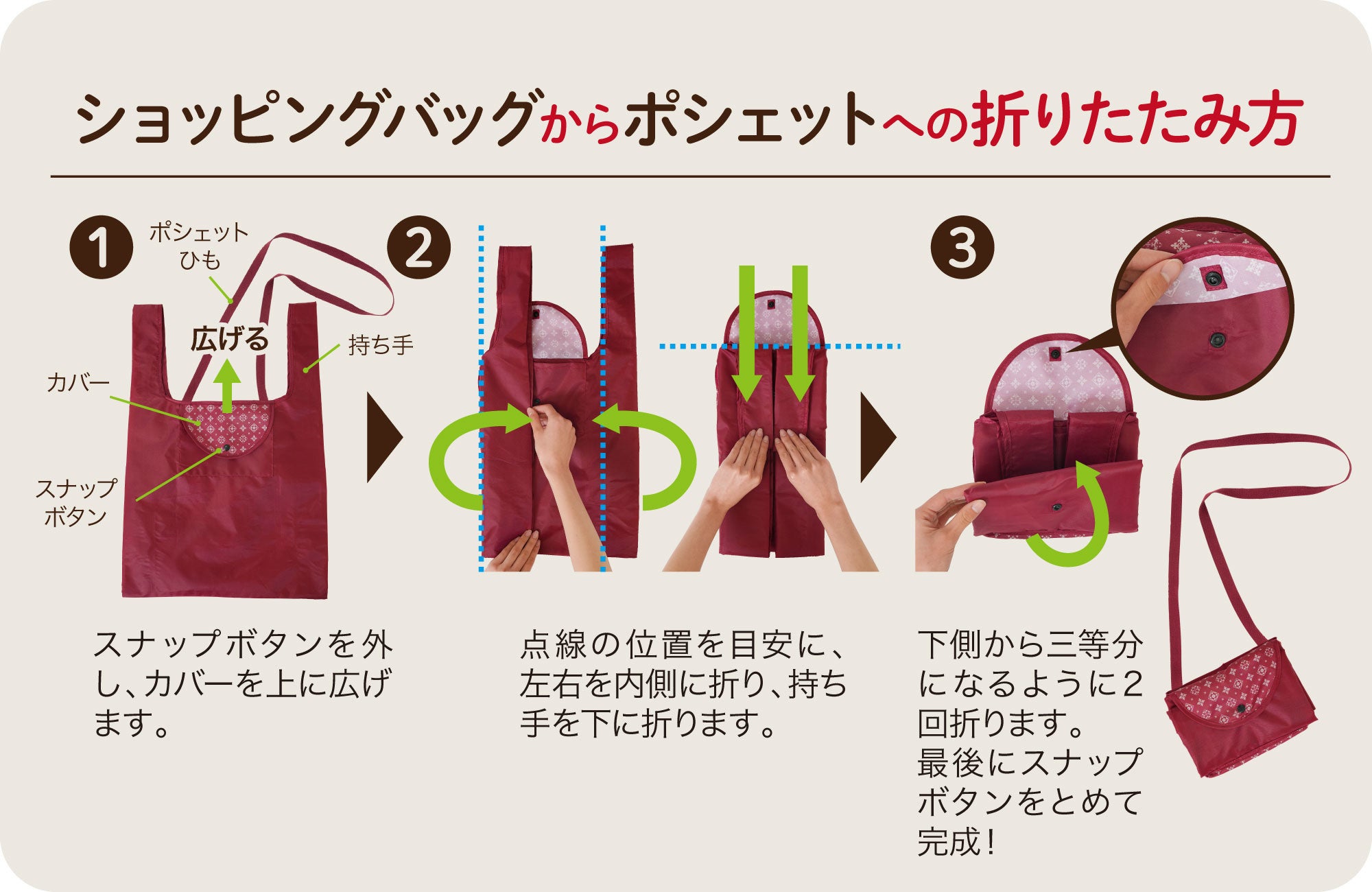たたみ方も3ステップだから簡単です!もう、エコバッグを忘れたということもなくなります!ポシェットひとつで身軽にお買い物!