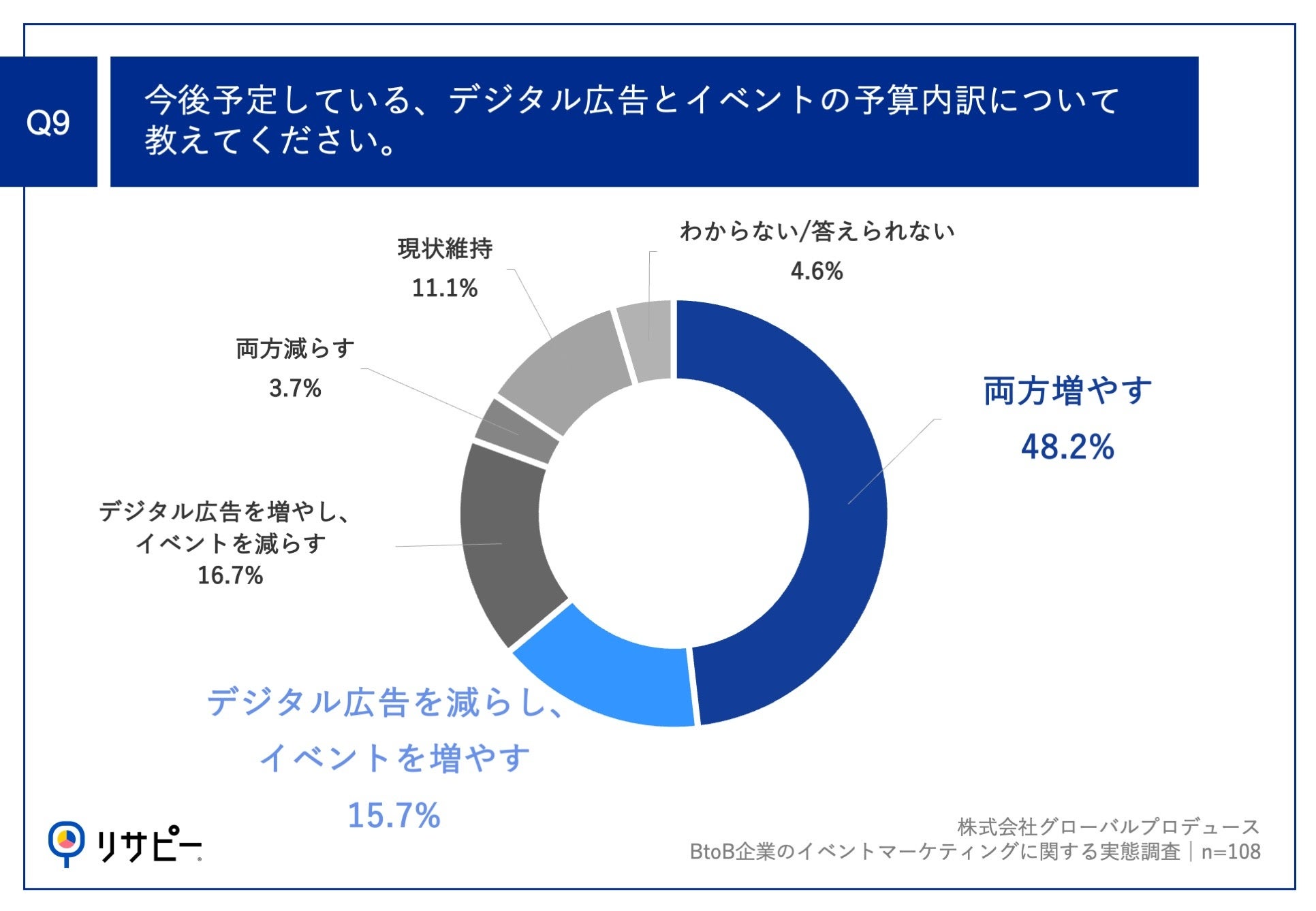 今後の予算方針については、「デジタル広告とイベントの両方を増やす」企業と「デジタル広告を見直し、イベントに投資する」企業が合わせて過半数を占め、広告費の一部が「リアル体験」へ振り向けられつつあります。