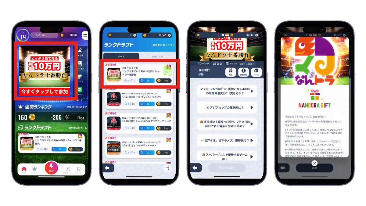 イノベーションの力で新たなスポーツ・エンターテインメントを創造し、まだ見ぬ感動と熱狂を提供するアプリ「なんドラ」を運営する株式会社なんでもドラフト(本社:東京都渋谷区、代表:森井啓允)は、特別企画『なんドラ十番勝負』2024年2月版を開催します。