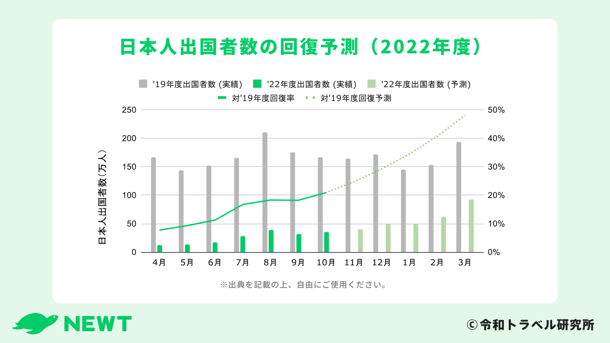 令和トラベル研究所の予測値では、2022年度中に、コロナ前と比較して47%までの回復を見込んでいます。