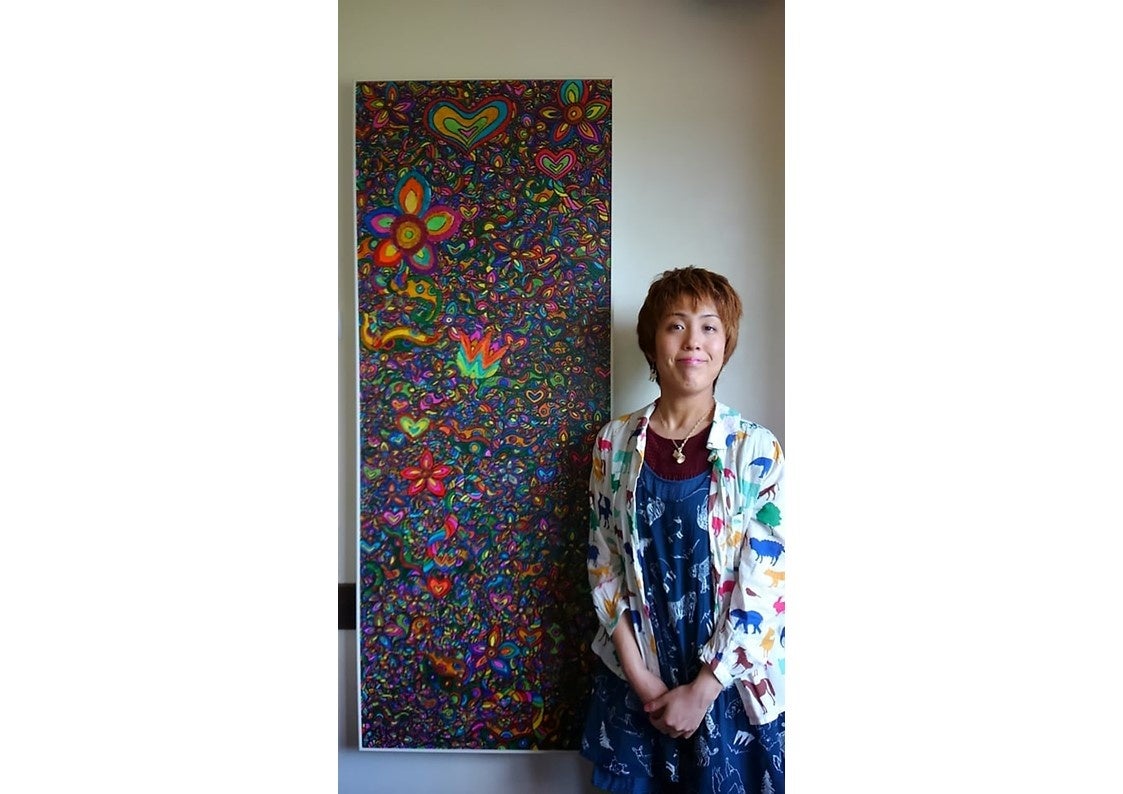 大仙市在住。⾃閉症であることで幼い頃はさまざまな苦境に直⾯することもありましたが、現在は⾃宅で営業しているヘアーサロンの店頭に⽴ち、お客様のシャンプーなどを担当する傍ら休⽇は精⼒的に絵を描き続けています。彼⼥が描く作品は、表情豊かでまるで楽しそうに会話をしているような動物達や、⾊鮮やかで溢れるほどの⽣命⼒を感じさせる草花が画⾯を⼀杯に埋め尽し、彼⼥の⼼が住む世界の⾵景です。同時に、現実世界に対する「あなたが笑顔でありますように」という彼⼥の願いが込められています。