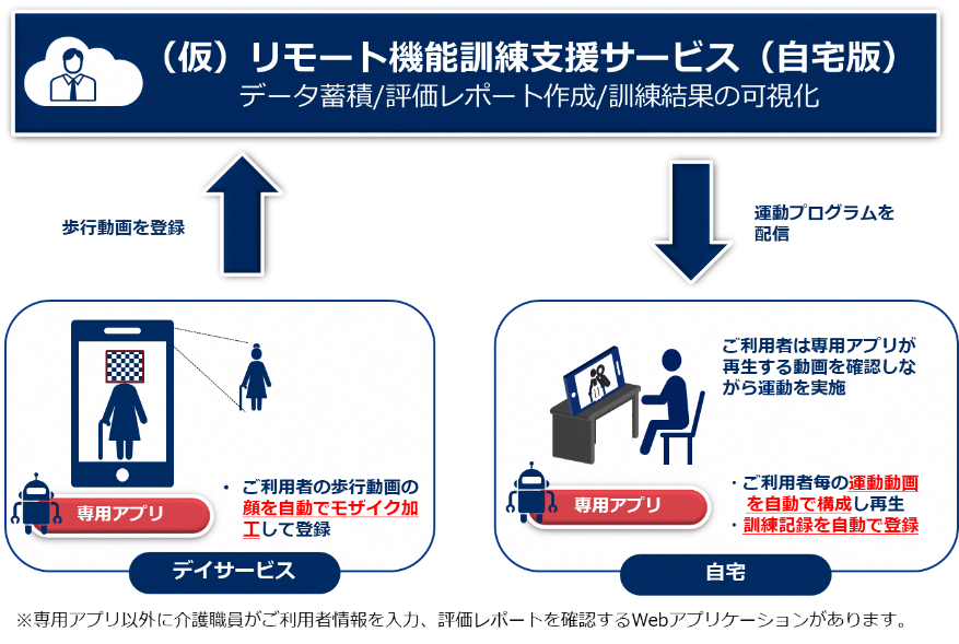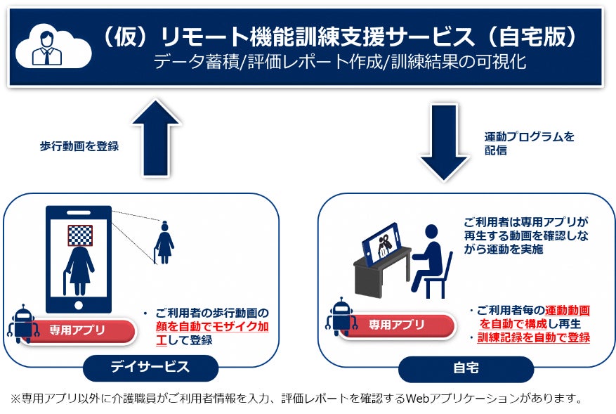 今回、本サービスを基に利用者が自宅でも機能訓練可能になるよう、健康状態の管理機能や、訓練状況やデイサービスからのメッセージを確認できるマイページ機能などを新たに開発し、実証実験で運用上の課題等を検証します。