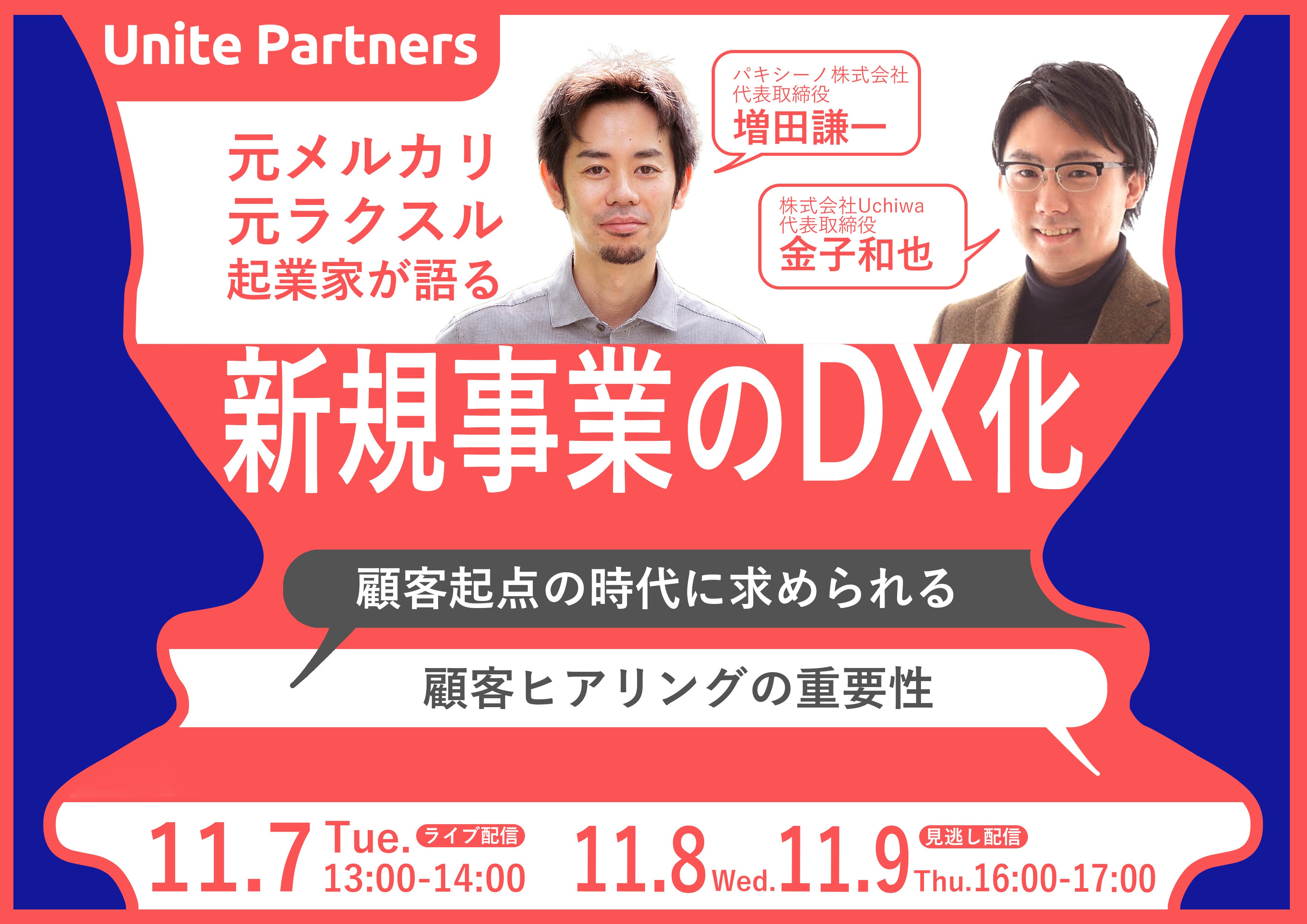 企業の変革パートナーを目指すブティック型コンサルティングファームのUnite Partners株式会社(本社:東京都、代表取締役:小林大輝)は、2023年11/7~9 に、「元メルカリ元ラクスル起業家が語る "新規事業のDX化" 〜顧客起点の時代に求められる顧客ヒアリングの重要性〜」と題して大企業の経営幹部の方向けのセミナーを開催します。
