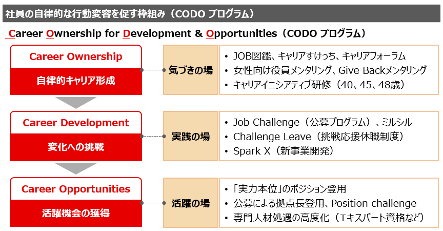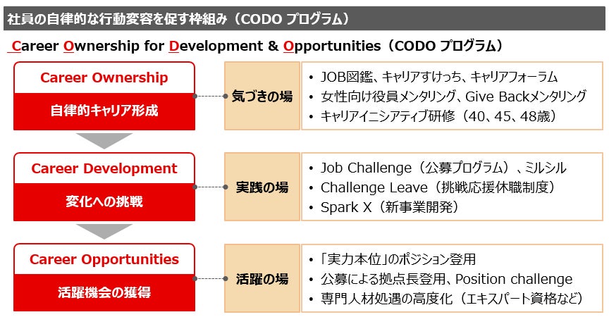 具体的には、「気づきの場」、「実践の場」、「活躍の場」を有機的に提供することで、社員の「自律的な行動変容」を促すことを目的とした、「行動変容プログラム(Career Ownership for Development and Opportunities、“CODO”)」を展開しています。