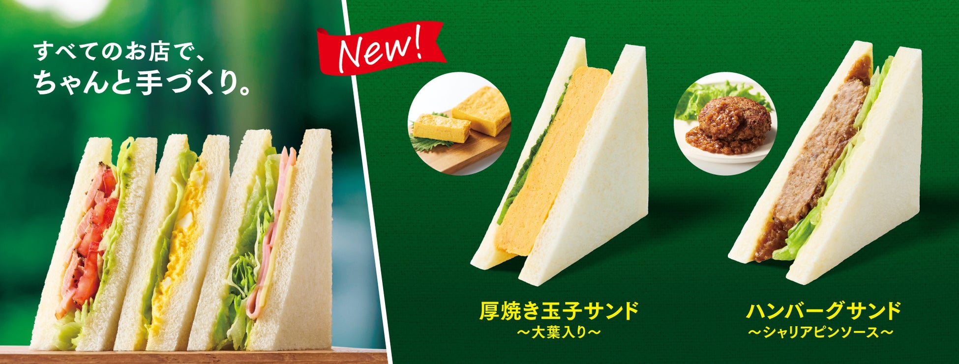 この度、手づくりサンドイッチに「厚焼き玉子サンド~大葉入り~」と「ハンバーグサンド~シャリアピンソース~」の2品が新登場します。「厚焼き玉子サンド~大葉入り~」は、甘みと旨みがジュワッと染み出す厚焼き玉子に、爽やかな香りが広がる大葉をサンドしました。「ハンバーグサンド~シャリアピンソース~」は、ふっくら柔らかいハンバーグに、玉ねぎと醤油を加えたシャリアピンソースを合わせています。どちらも見た目のインパクトのある、ボリューム満点なサンドイッチです。