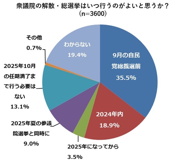 次の衆議院議員選挙について、いつ行うのが好ましいかを聞いた。調査実施が7月のため「9月の自民党総裁選挙の前」という回答が多く、次が「2024年内」。いずれにせよ次の任期満了を待たず早い時期、年内での総選挙実施が適当と考える人が過半数となった。