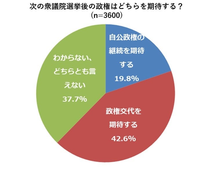調査時点では、次の総選挙での「政権交代を期待する」が42.6%となり、「自公政権の継続を期待する」を上回っている。しかしながら「わからない・どちらとも言えない」が37.7%と非常に大きな割合を占め、今後の総選挙までに有権者がどのような情報を得るかで、判断が大きく揺れ動く可能性が高そうだ。