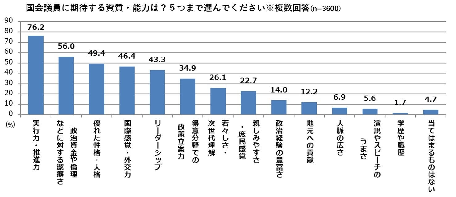 最近では、議員の倫理観が問われる事件が続いた。「次に選ぶ国会議員に期待したい資質・能力」を聞いたところ、「実行力・推進力」「政治資金や倫理になどに対する潔癖さ」「優れた性格・人格」がトップスリー。その他、「国際感覚・外交力」「リーダーシップ」などが高く、「地元への貢献」や「人脈の広さ」などを選ぶ人は比較的少なかった。自由記述での「あなたが選挙で選ばれる国会議員に期待したいこと、望むこと」への回答でも、アクティブで実行力と倫理観に優れ、国民と向き合う政治家が求められてる。
