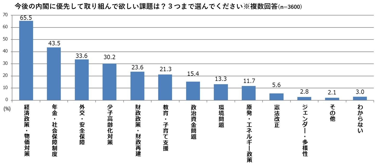 次の内閣に優先して取り組んでほしい課題を複数回答で聞いた。1位は生活に直接の影響を持つ「経済政策・物価対策」。2位は本調査の回答者の傾向を反映しての「年金・社会保障制度」。3位は不安定な世界情勢の影響がうかがえる「外交・安全保障」。対応が必要な政治課題は多岐にわたり、個人レベルではその人のライフステージや状況に直結する課題が重視されるが、次の内閣は、優先する課題の選び方も含め、未来の日本全体のグランドデザインを示すことが必要と考えられる。