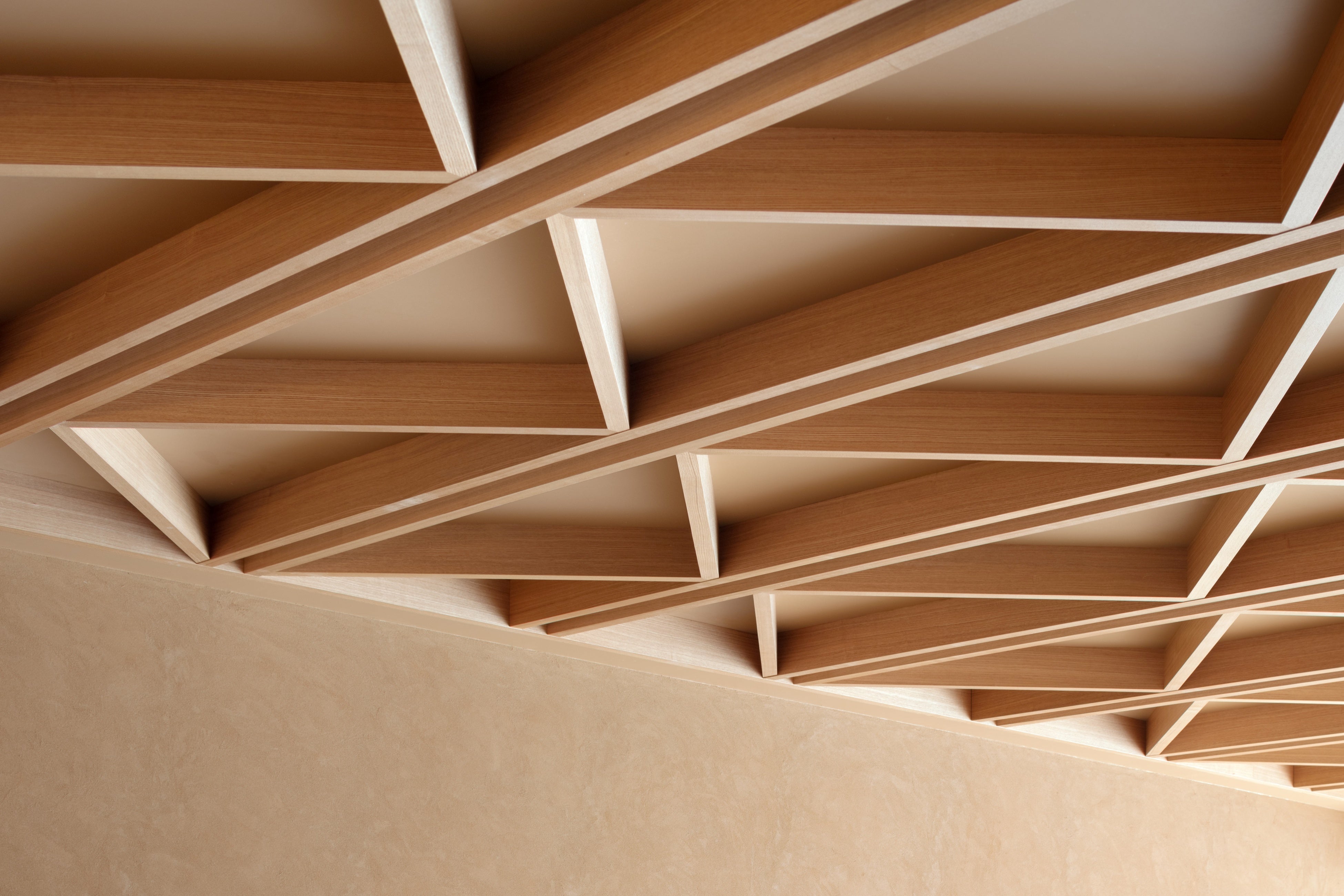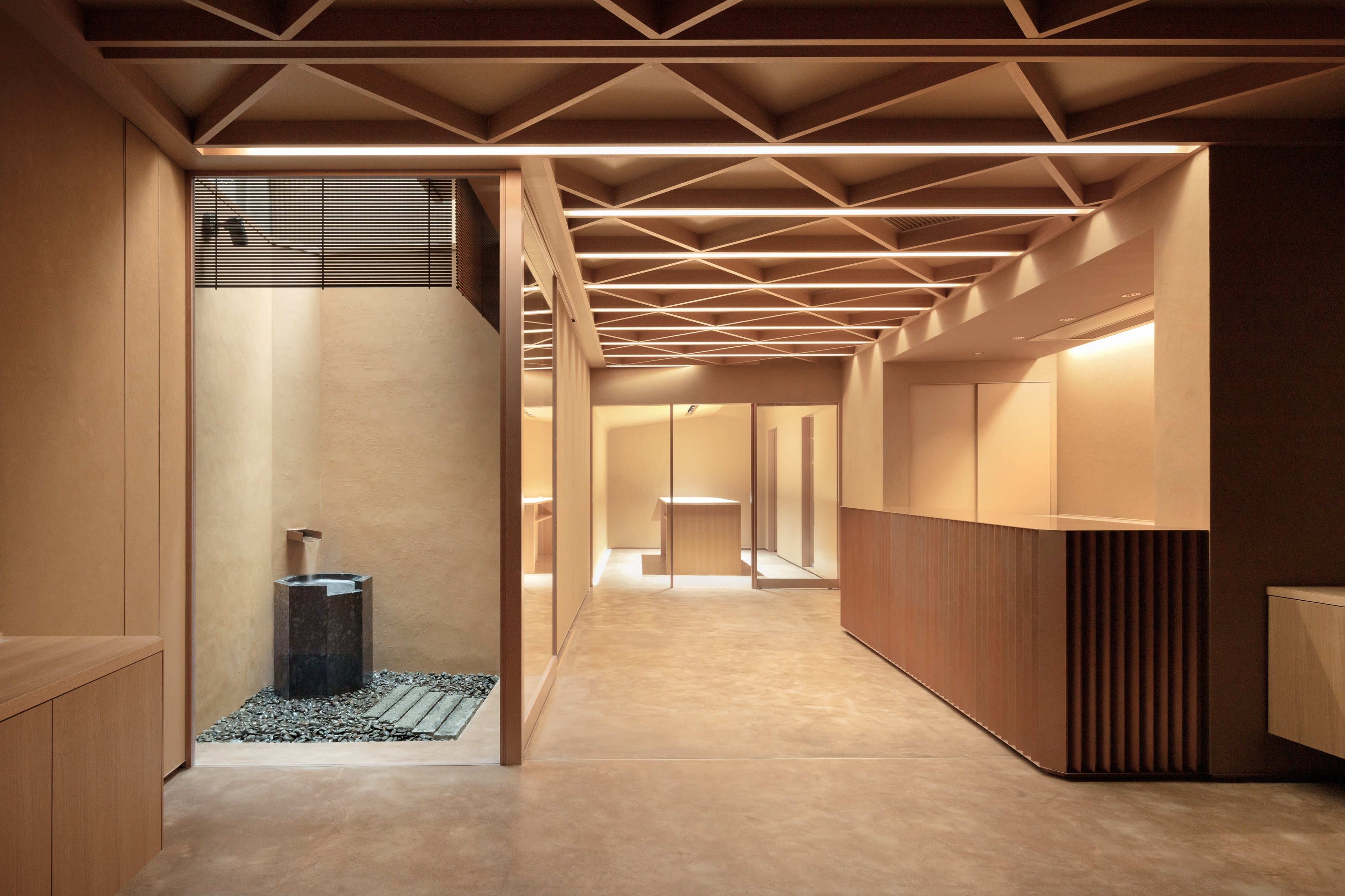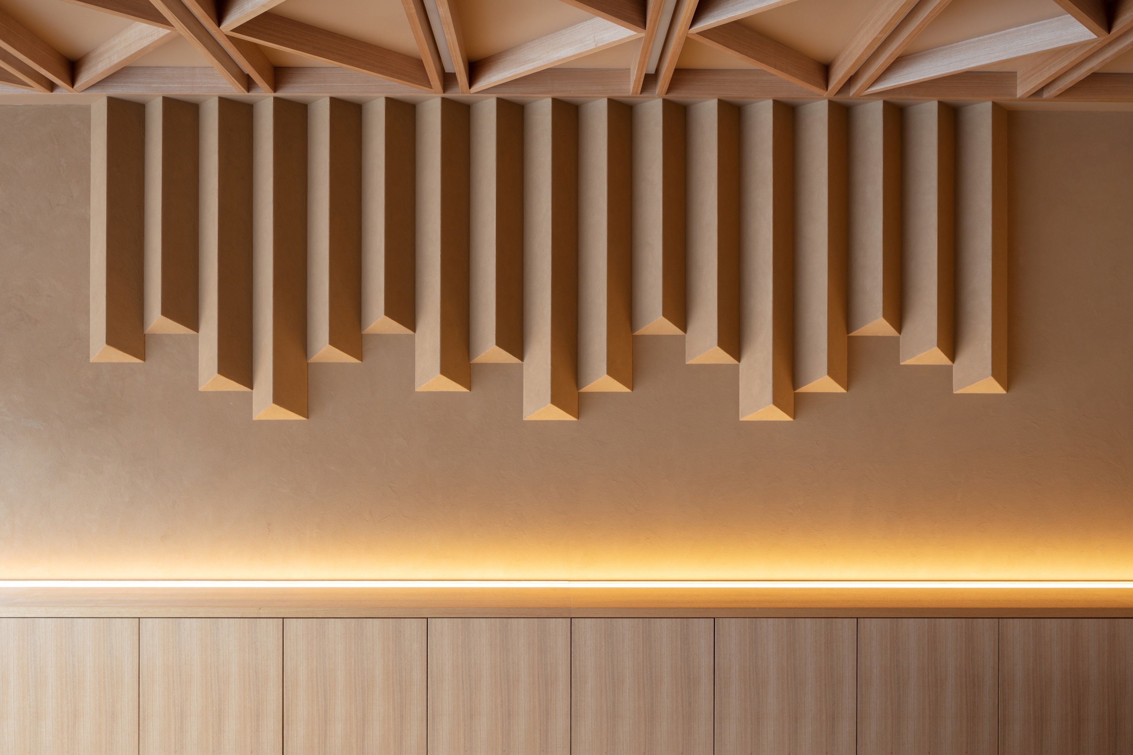 ・日本の伝統的な格天井を「おたべ」の形である三角形にアレンジ。LED照明と組み合わせた現代的なデザイン