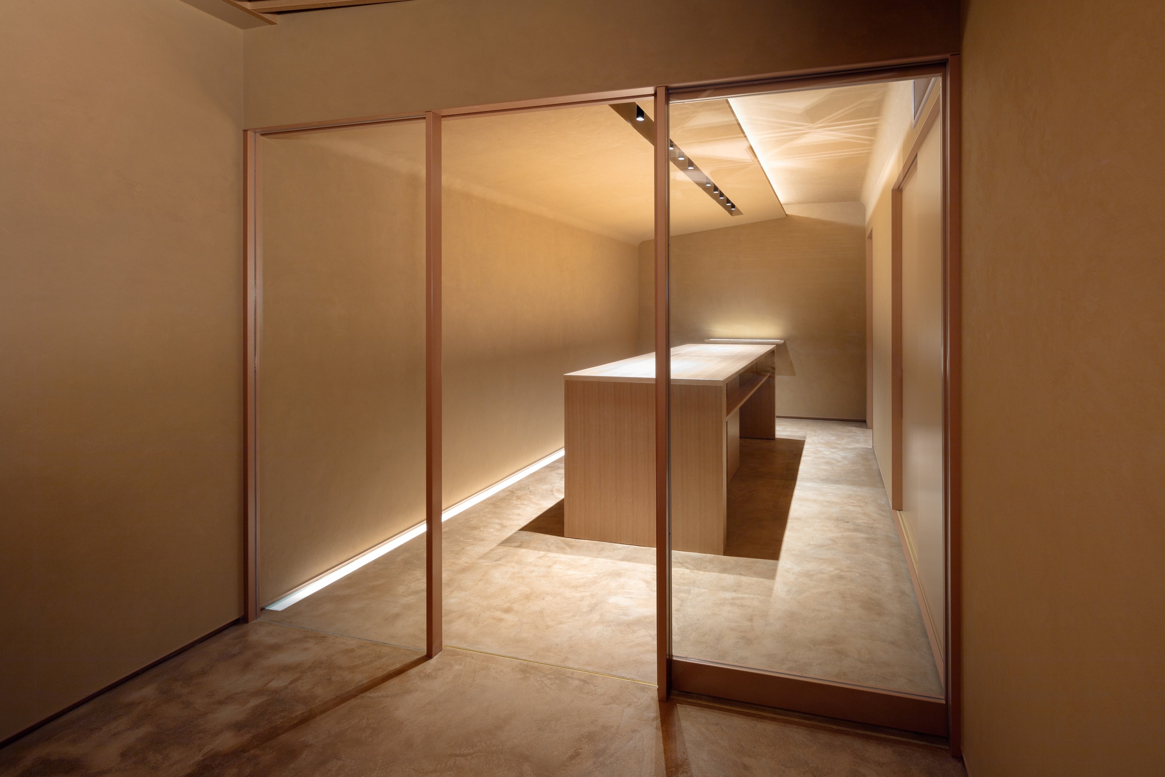・店舗奥に設置した「おたべ手作り体験」を実施する部屋は、現代の茶室に見立て、あえて天井を低く設計