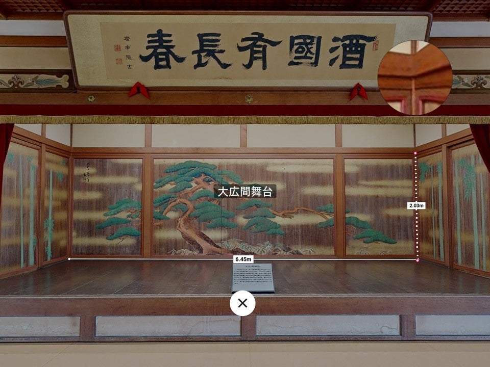 文化財デジタルアーカイブとして映像保存したデータは、いつでも、どこからでも活用することが可能です。計測機能を利用し、VR空間内の各部位の寸法を計測できるため、研究調査や貸館利用の際に来館せずに内部見学ができます。