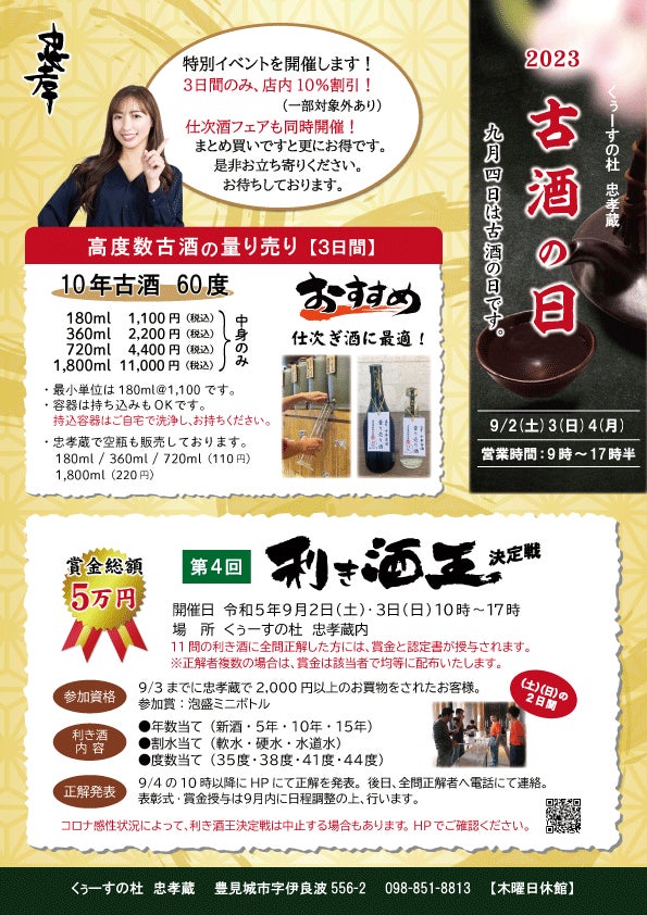 また「くぅーすの杜 忠孝蔵」ではご来店のお客様を対象に9/2(土)〜9/4(月)の3日間古酒の日イベントを開催。