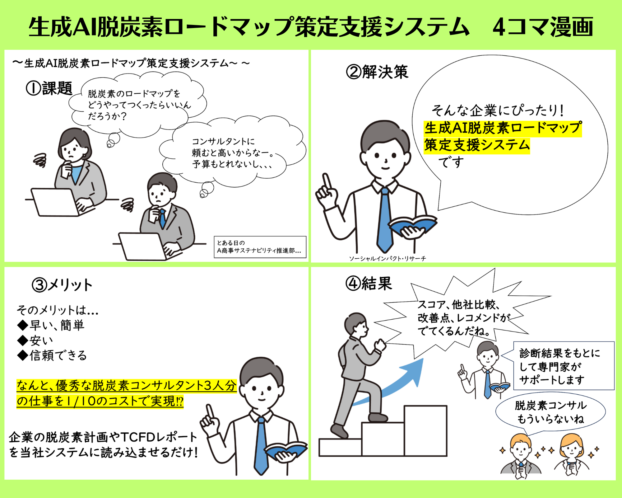 ・”生成AI脱炭素ロードマップ策定支援システム”を利用することで、優秀な脱炭素支援コンサルタントの3人分の仕事を1/10のコストで実現できます。