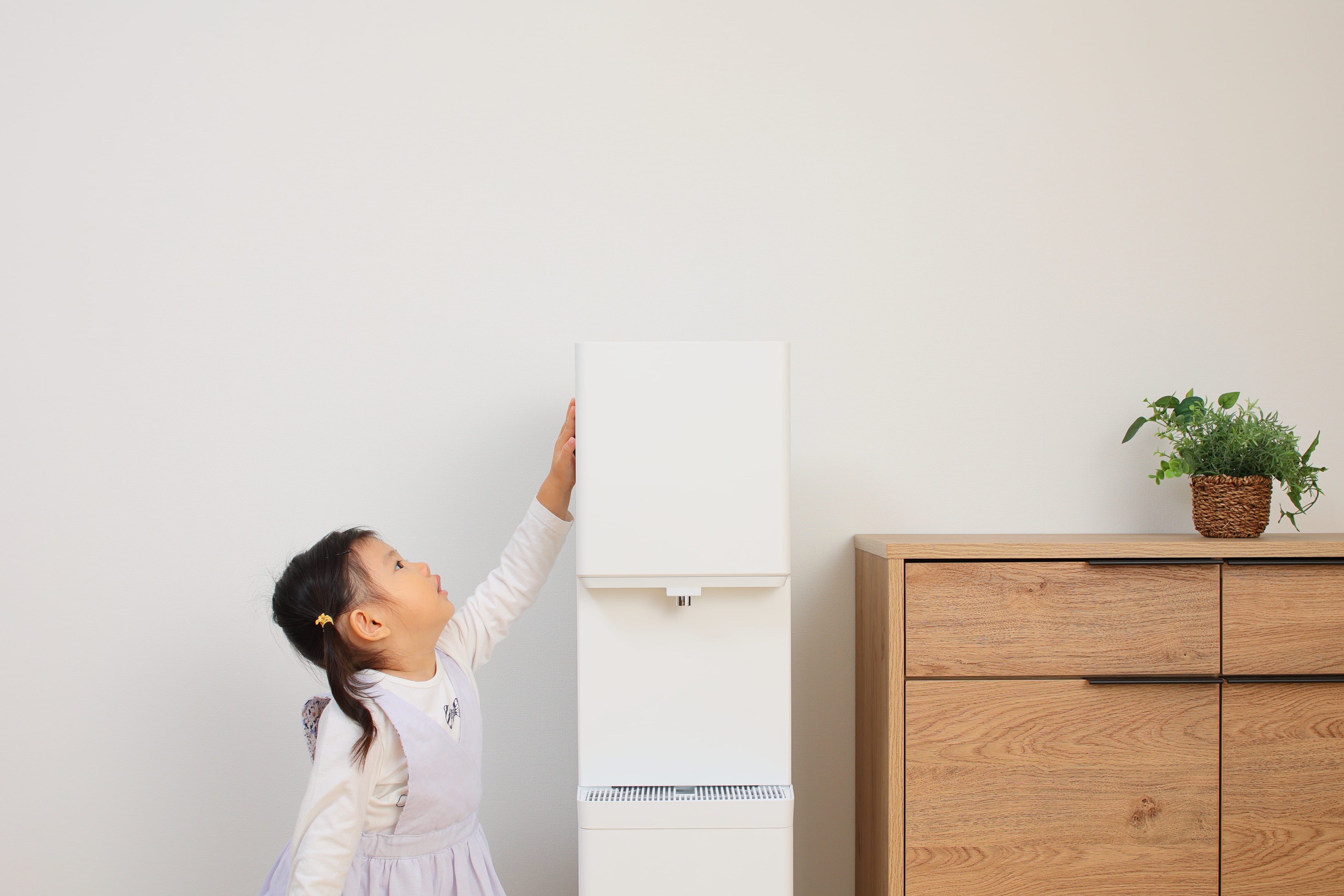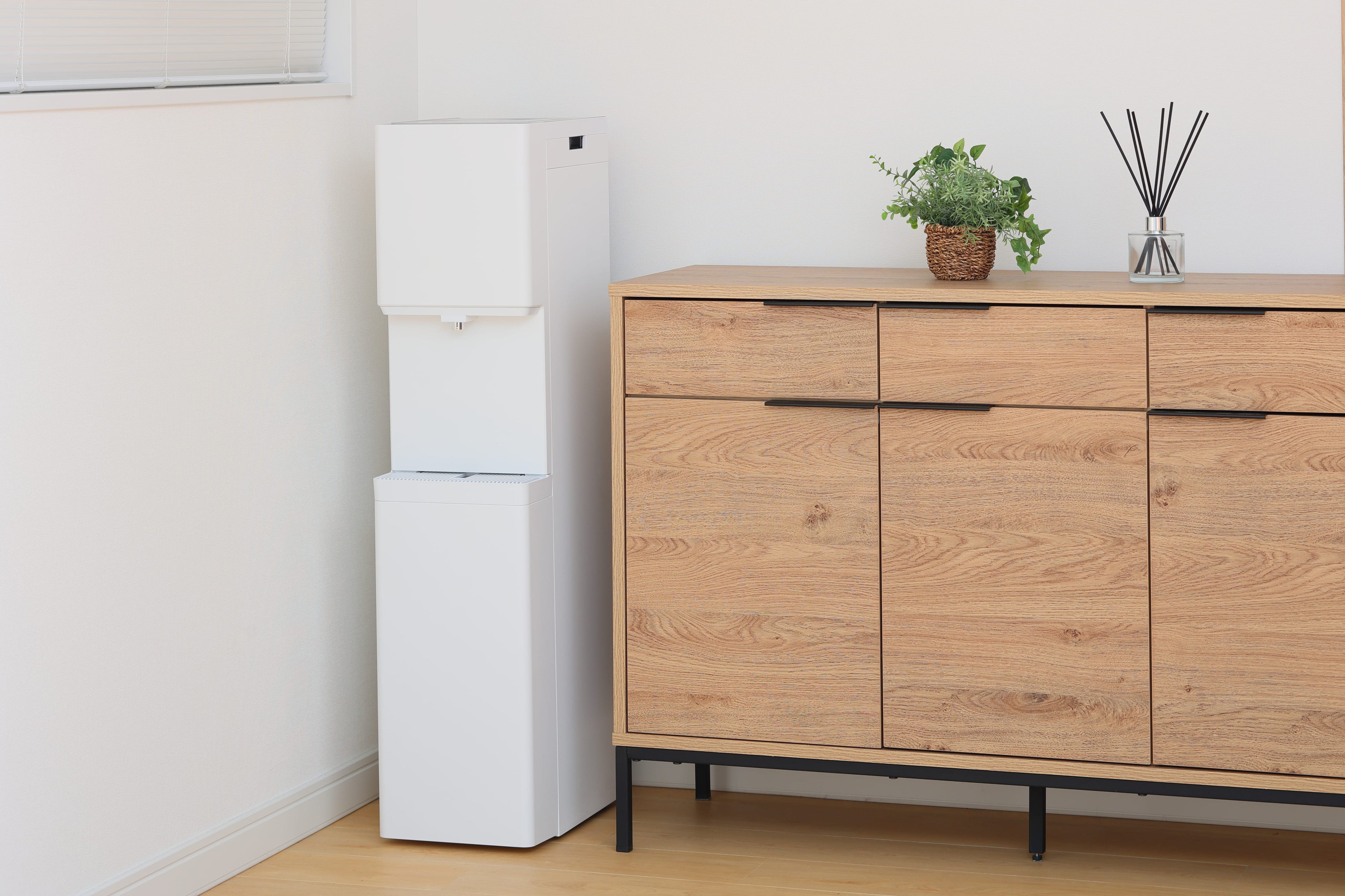 狭いスペースでも設置できるように、横幅が25cmの省スペース設計。さらに、タンクは内蔵されているので高さも取らずにスッキリした外観です。コンセントさえ近くにあればどこにでも設置できます。
