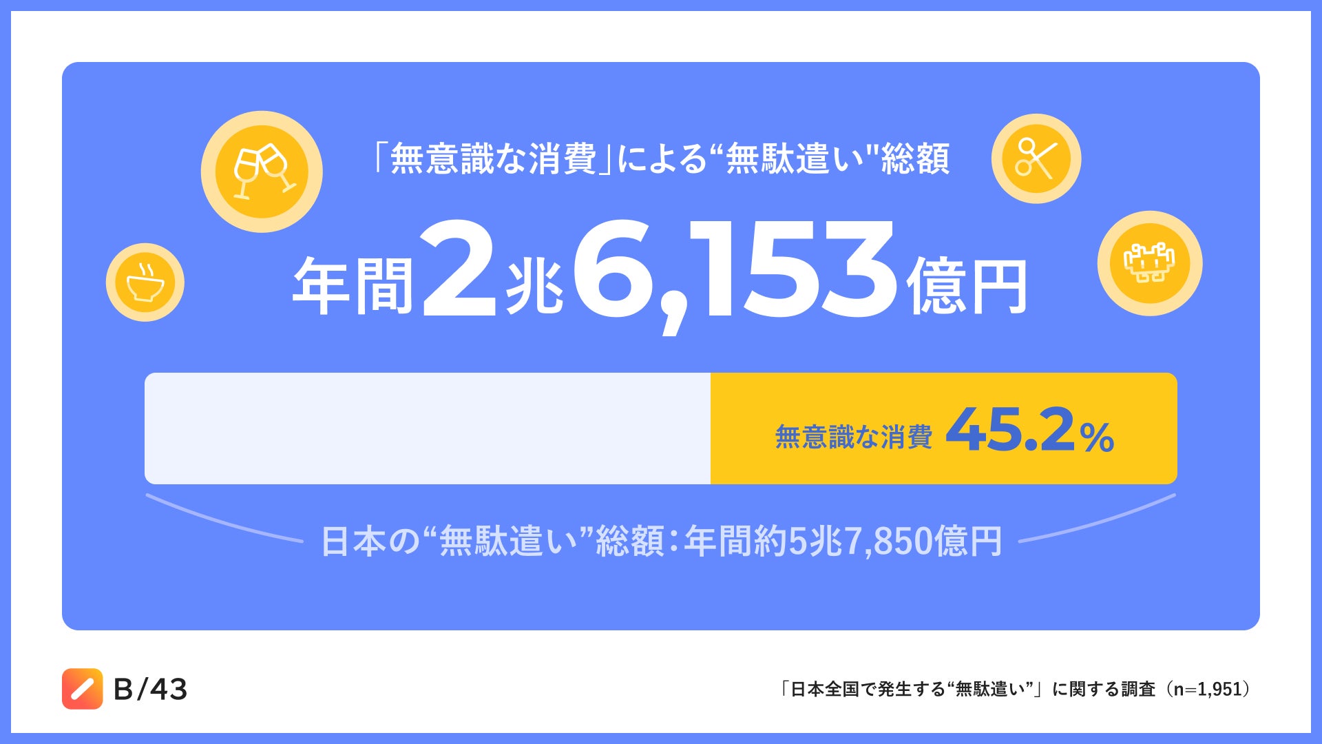 日本全国で発生する“無駄遣い”の総額のうち、「無意識な消費」による“無駄遣い”は、年間で推計約2兆6,153億円となり、全体の45.2%が計画性のないまま購入してしまった「無意識な消費」であることがわかりました。