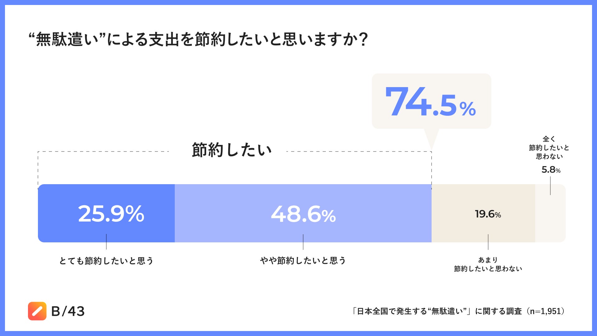 “無駄遣い”による支出を今後節約したいと思うかを質問したところ、25.9%が「とても節約したいと思う」、48.6%が「やや節約したいと思う」と回答し、合わせて74.5%が「“無駄遣い”による支出を節約したい」と感じていることがわかりました。
