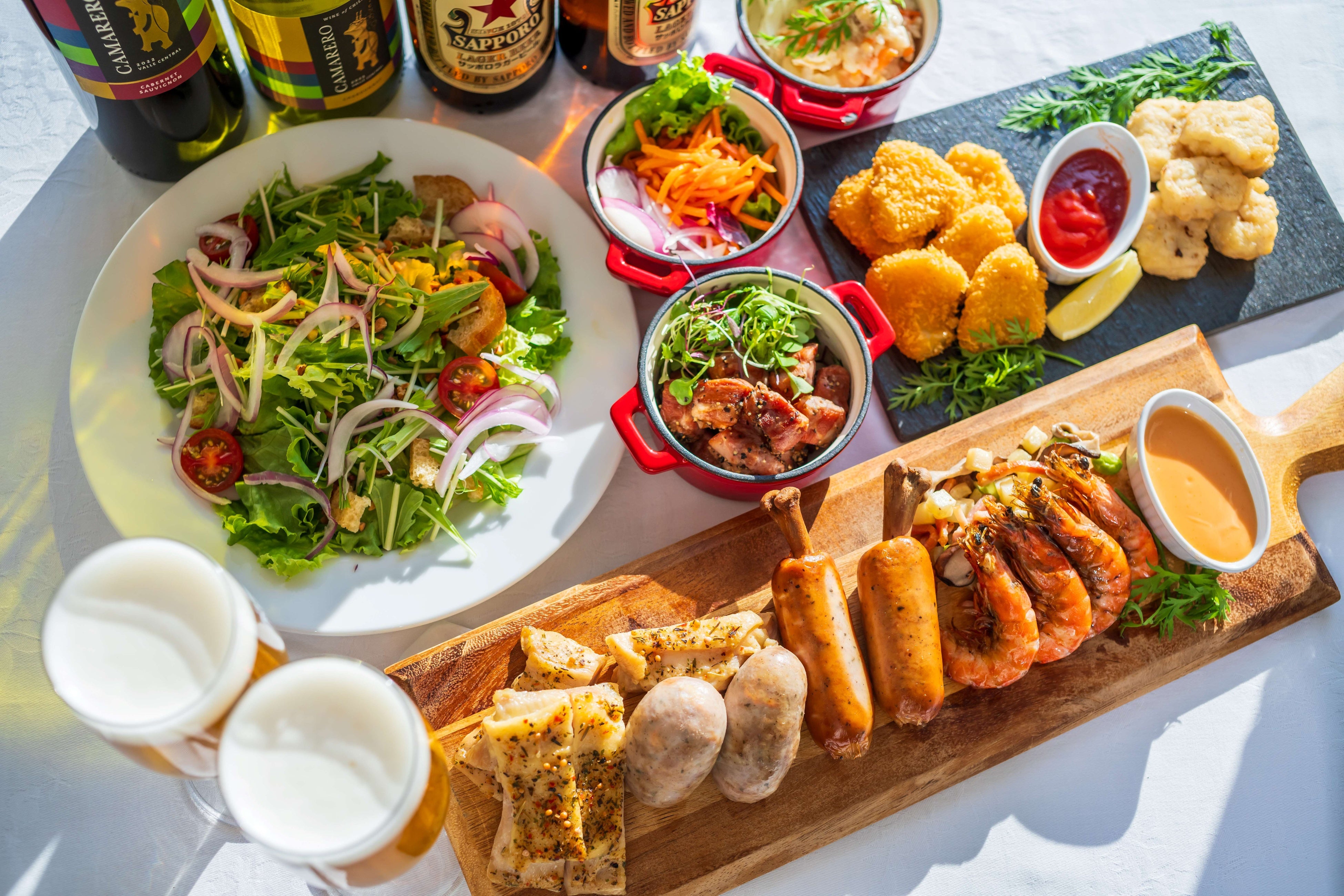 ご用意したお料理は、おつまみとして王道のソーセージやグリルチキンをはじめ、エスカベッシュや合鴨ひとくちパストラミ、キャロットラペといった心躍る逸品も。どれもシェフ自慢のものばかりです。