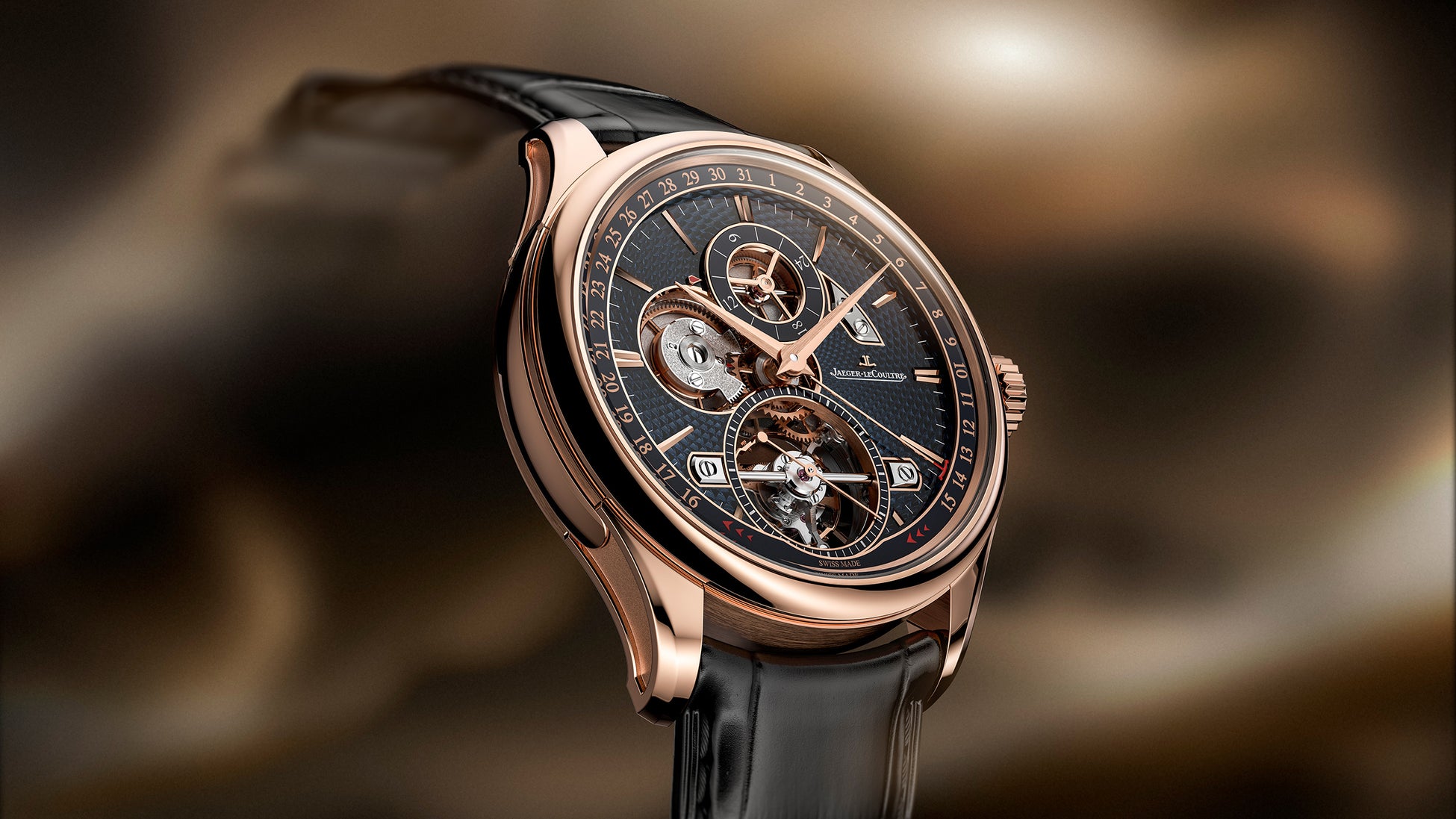 ジャガー・ルクルトは、マスター・グランド・トラディション・トゥールビヨン・ジャンピングデイトにおいて、時計の歴史に名を刻む同名ムーブメントの地位を称え、確かな精度と洗練された現代的な美学を融合させています。