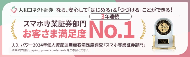 大和証券グループの大和コネクト証券株式会社(本社:東京都中央区、代表取締役:大槻 竜児、以下「当社」)は、国際的な顧客満足度調査の専門機関である株式会社J.D. パワー ジャパン(本社:東京都港区、代表取締役社長:山本 浩二、以下「J.D. パワー」)が2024年7月11日に発表した「J.D. パワー 2024年個人資産運用顧客満足度調査SM」の「スマホ専業証券 部門」において、3年連続で総合満足度ランキング1位を受賞しましたことをお知らせいたします。