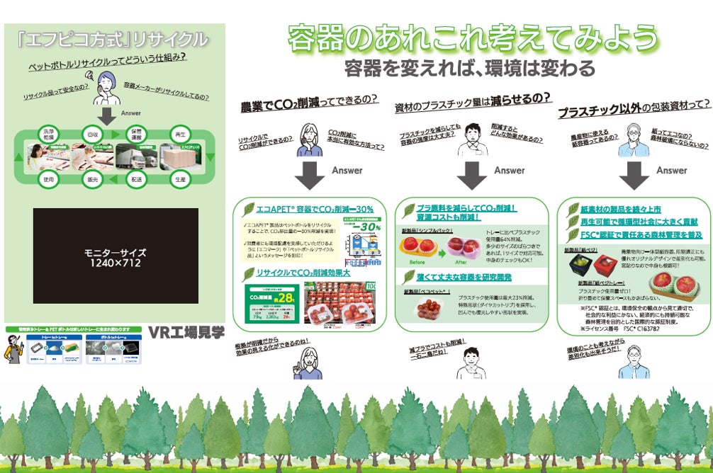 環境コーナーでは、SDGsなど環境保全に対する意識が世界的に高まる中、「容器を変えれば環境が変わる」という視点で、問題提起から解決までをQ&A形式で分かり易く展示しております。