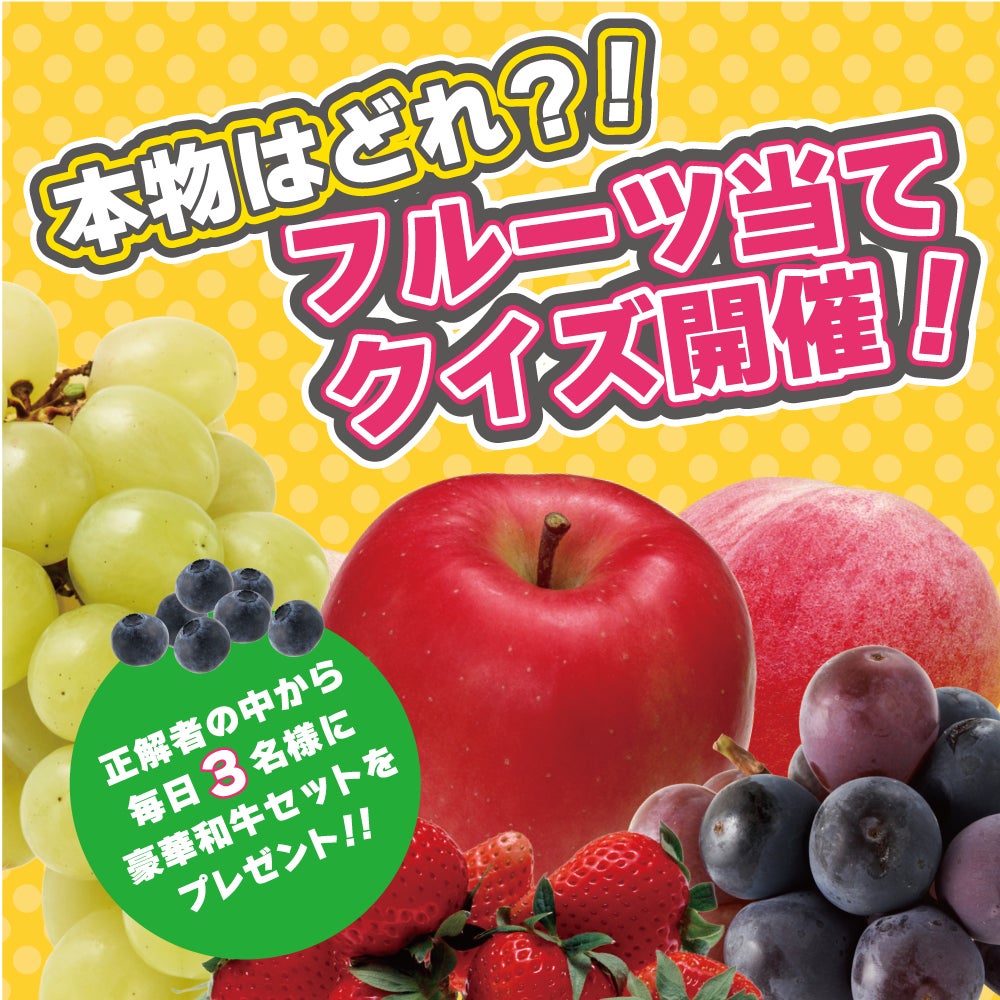 クイズコーナーに置かれた、本物と偽物のフルーツの中から、本物のフルーツを当てるクイズ企画を実施します。展示会場とInstagram上で参加して頂けます、会期3日間で毎日1問づつ出題し、正解者の中から各回3名様に豪華和牛セットをプレゼント。