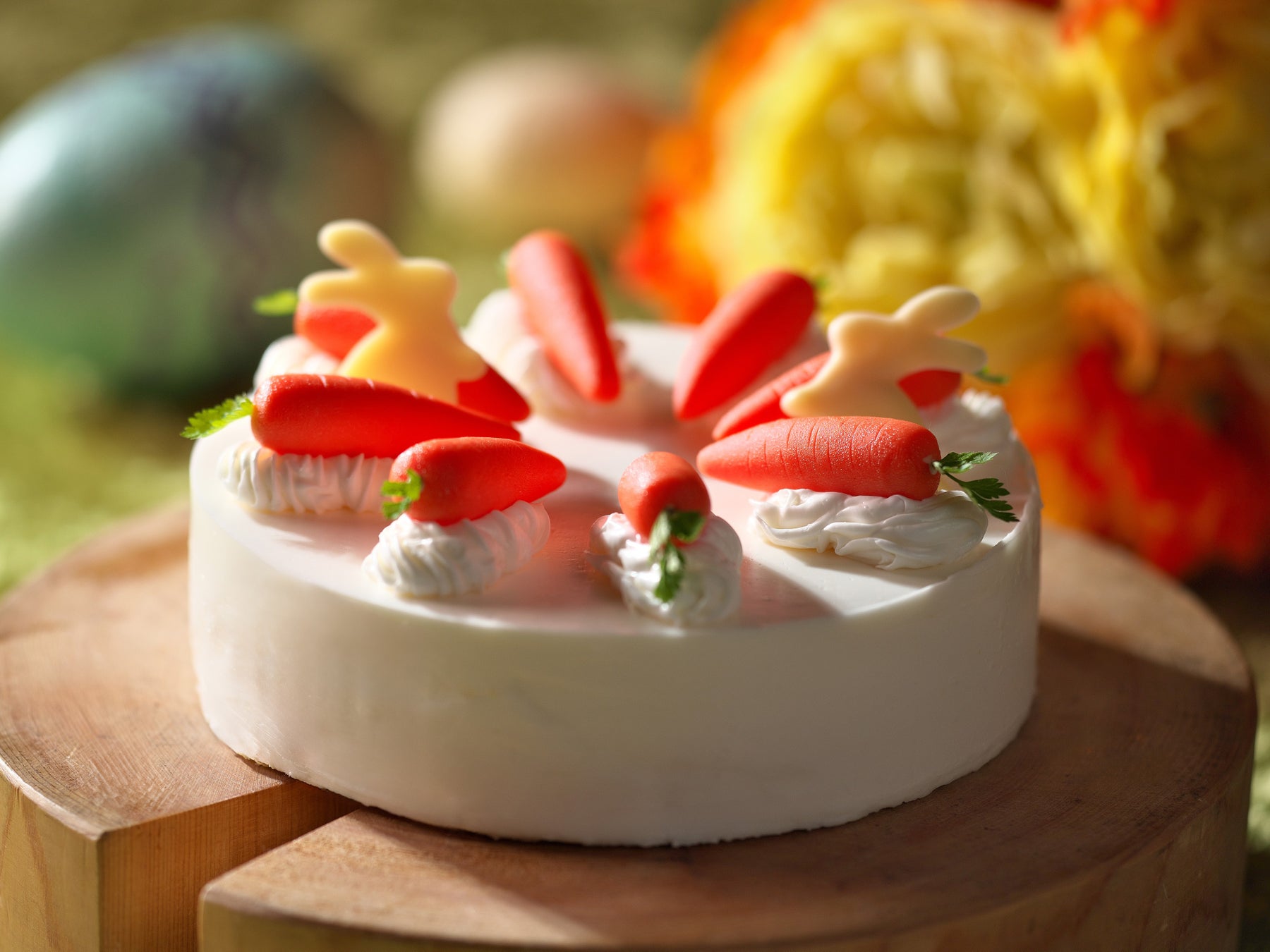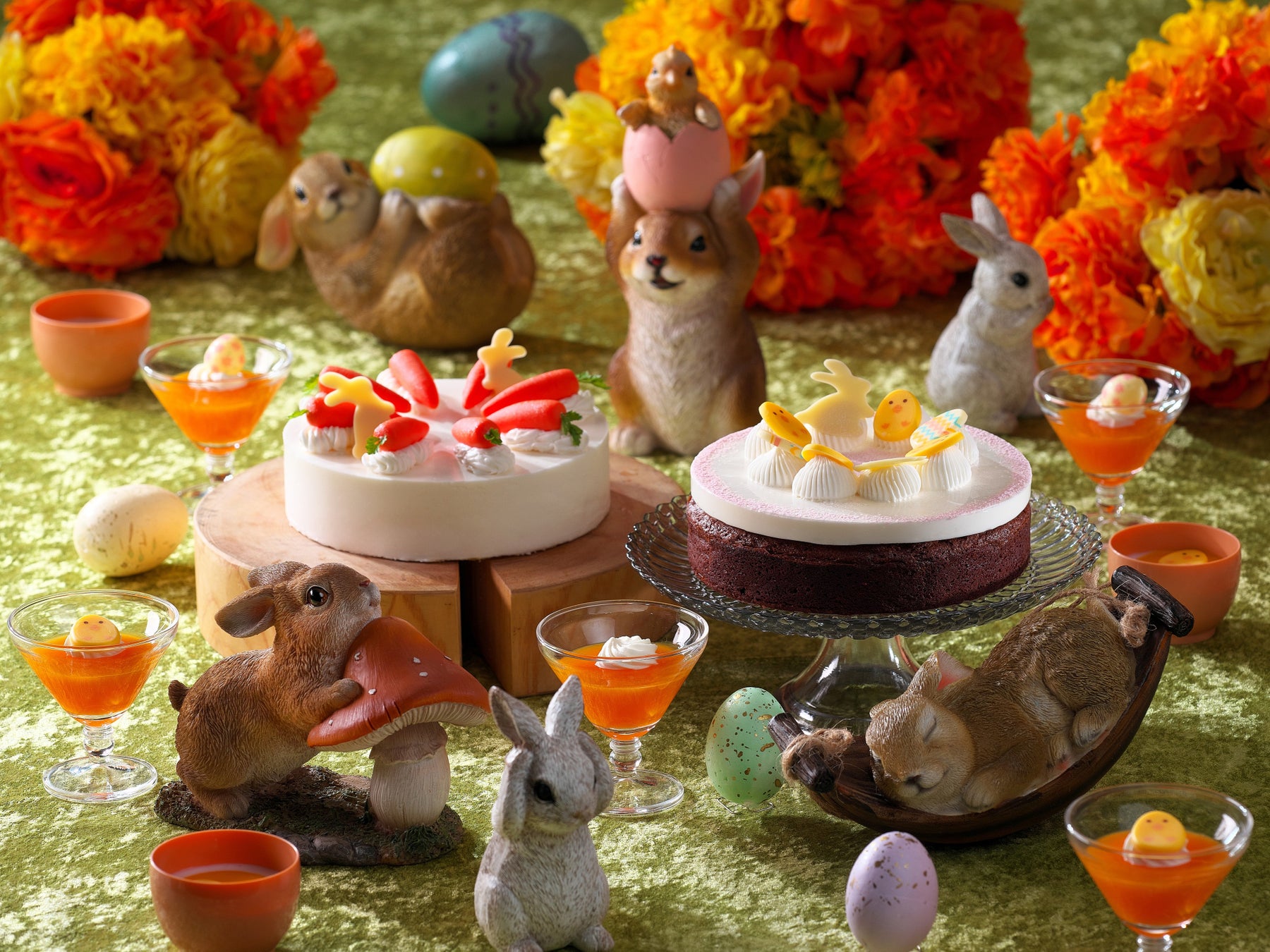 ニンジンが乗った「キャロットケーキ」に、イギリスやアイルランドにてイースター時期に食べる伝統的な「シムネルケーキ」や、エッグ杏仁、キャロットゼリー全4種類がお楽しみいただけます。