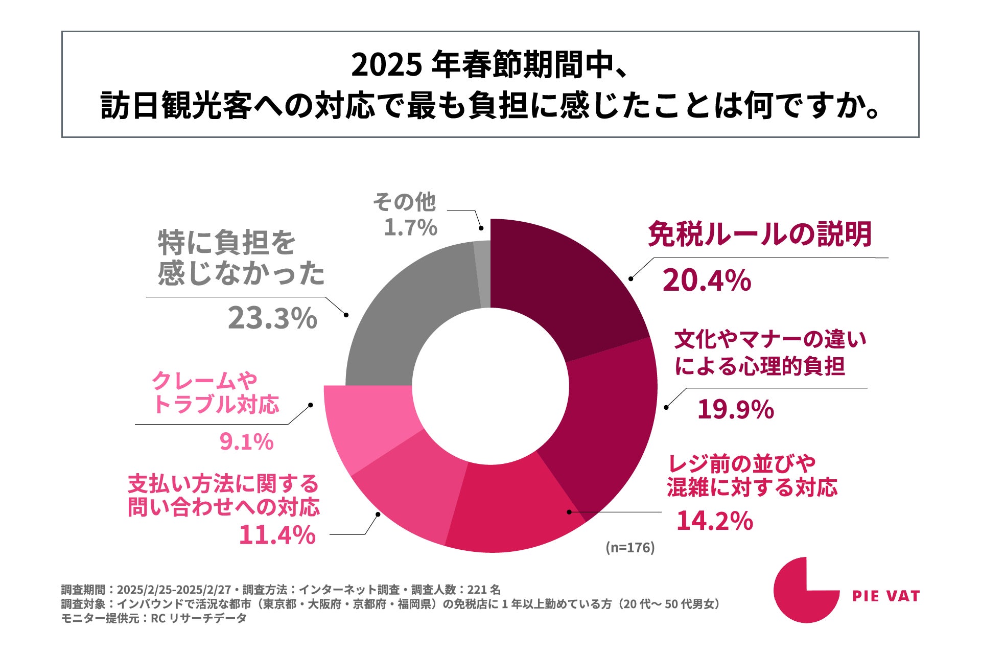 今回の調査結果から2025年の春節期間中は前年よりも混雑し、訪日観光客への対応で最も負担に感じたことは「免税ルールの説明」であることが明らかになりました。