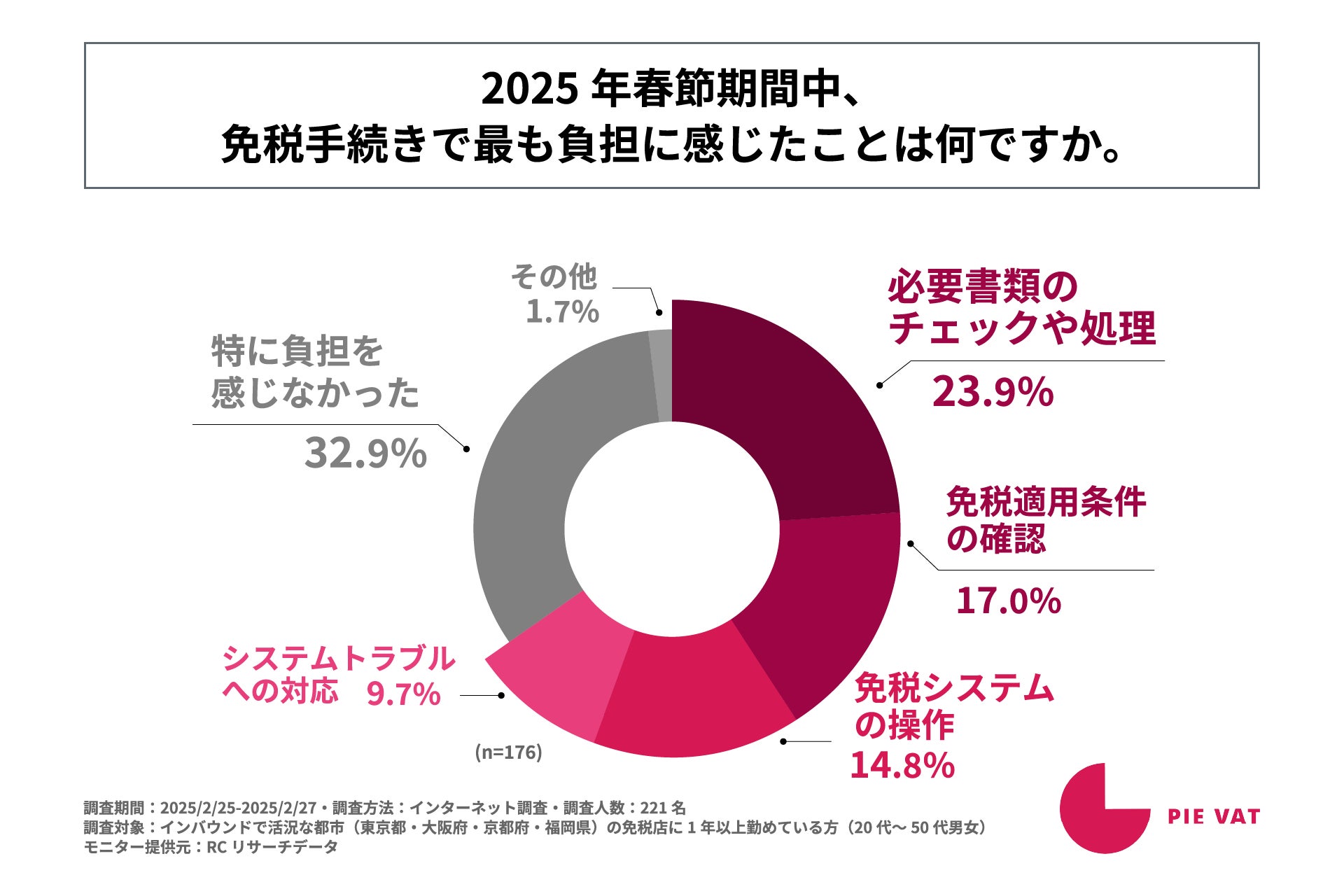 続いて、2025年春節期間中の免税手続きの業務の負担感を前年と同じ程度かそれ以上に感じたと回答された方に「2025年春節期間中、免税手続きで最も負担に感じたことは何か」を尋ねる設問への回答では、1位が「特に負担を感じなかった」で32.9%、2位が「必要書類のチェックや処理」で23.9%、3位が「免税適用条件の確認」で17.0%という結果となりました。この結果から、特に負担を感じなかった人も多くいるものの、「必要書類のチェックや処理」を負担に感じた人が多かったことが判明しました。