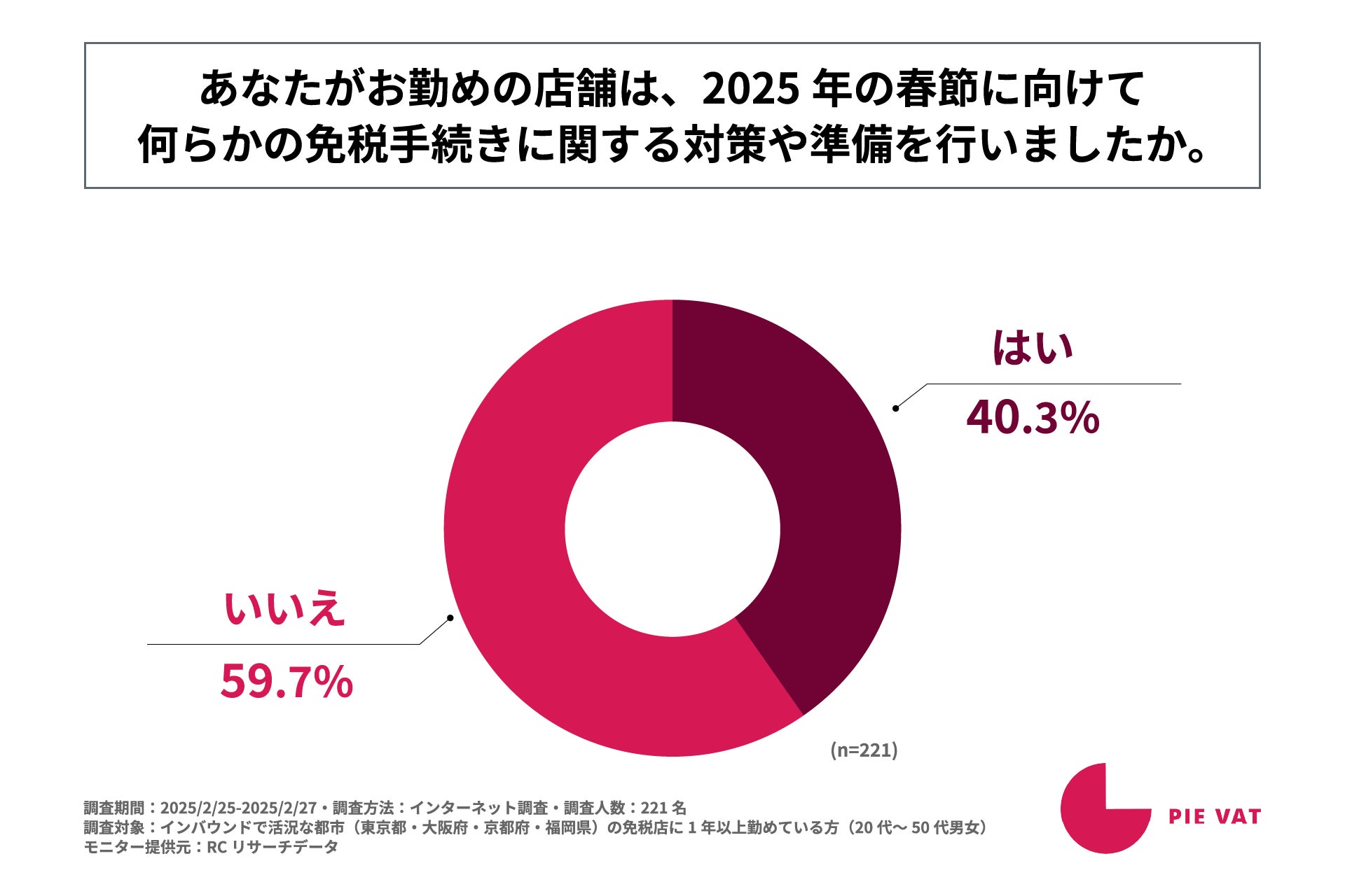 次に「勤めている店舗で、2025年の春節に向けて何らかの免税手続きに関する対策や準備を行ったか」を問う設問への回答では、「いいえ」が59.7%、「はい」で40.3%という結果になりました。この結果から、2025年の春節に向けて何らかの免税手続きに関する準備や対策を行った免税店は約4割であることが明らかになりました。
