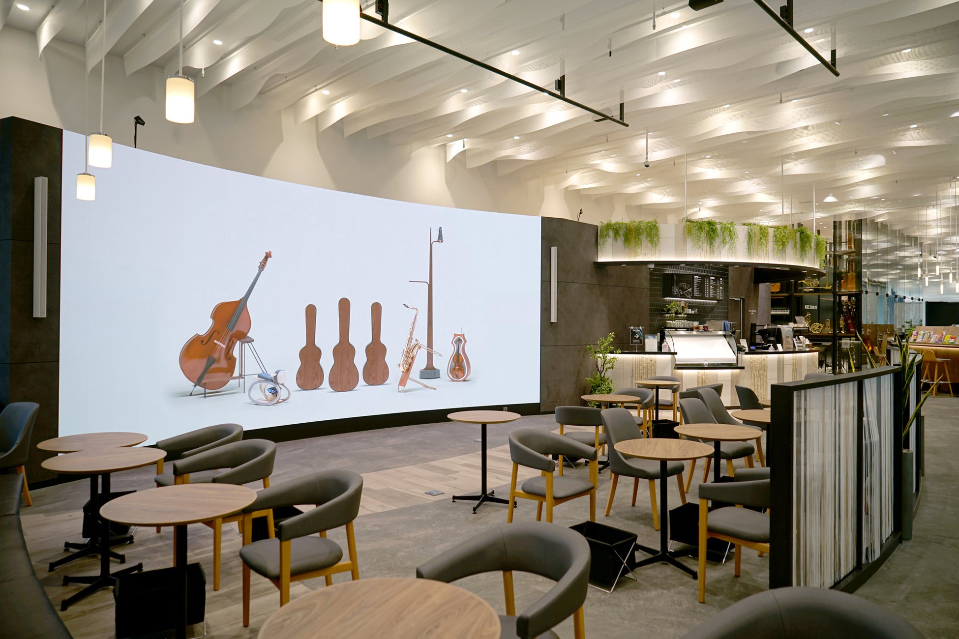 「ヤマハミュージック 横浜みなとみらい」は、音楽や楽器に関する新たな楽しみの発見を目的とした体験型施設です。当社ヒビノクロマテック Div.は、自社製LEDディスプレイ・システムを基軸に、当社グループの総合力を活かしたAV&ITのトータル・ソリューションを提供することで、世界最高水準の映像品質と安定性、多様な運用に対応する柔軟性を兼ね備えた複合システムをご提案できる構築力、及び長期の安定運用を実現する保守・サポート力に高い評価をいただいています。今回の案件では、音楽に没入できる体験空間「Music Canvas(ミュージックキャンバス)」及びイベントスペースを兼ね備えたカフェ「ライブ&カフェ」に、LEDディスプレイを中心とした映像システム及び演出連動システムを設計・施工しました。