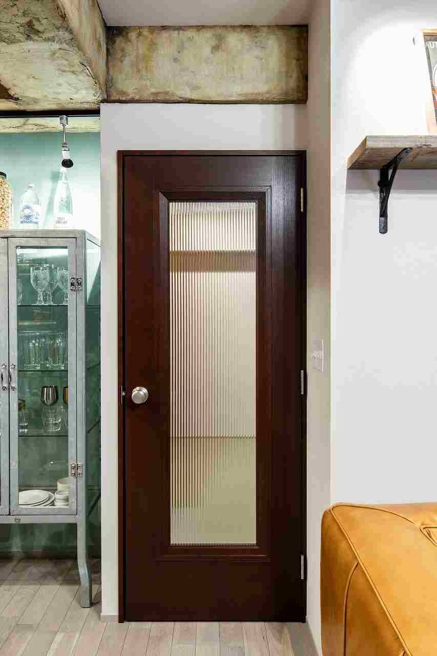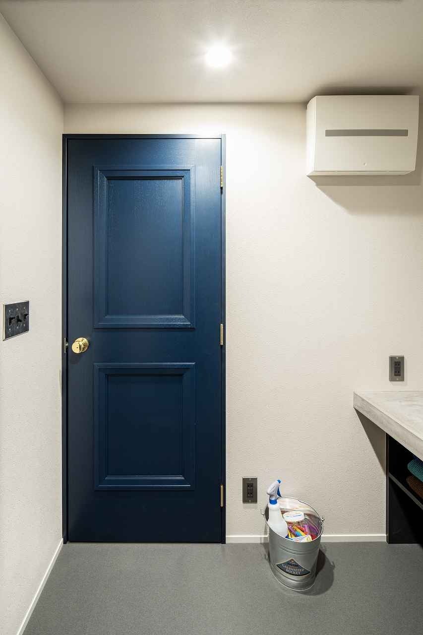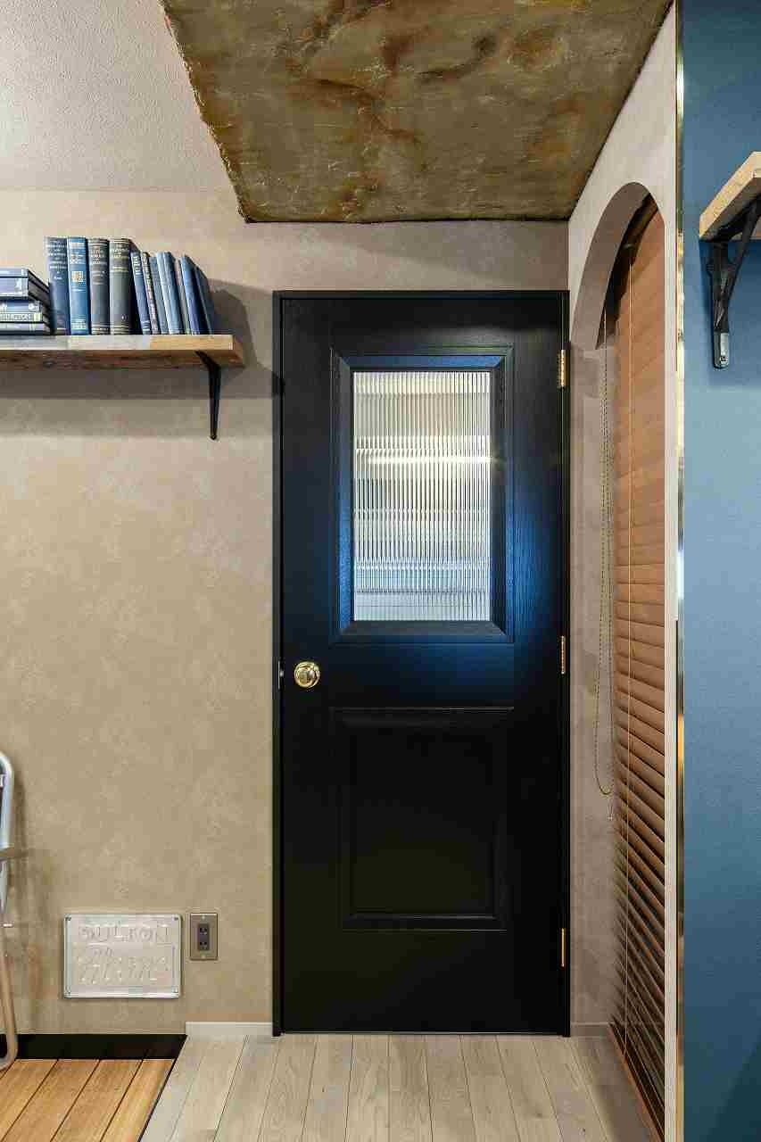 ダルトンオリジナル建具のひとつにオリジナルドアがあります。洗面室とトイレにはそれぞれ色違い、形違いのオリジナルドアを採用しました。トイレはグリーンの壁紙との相性が良いネイビーのドアを採用。洗面室の入口はブラックのガラス窓付きのドアです。
