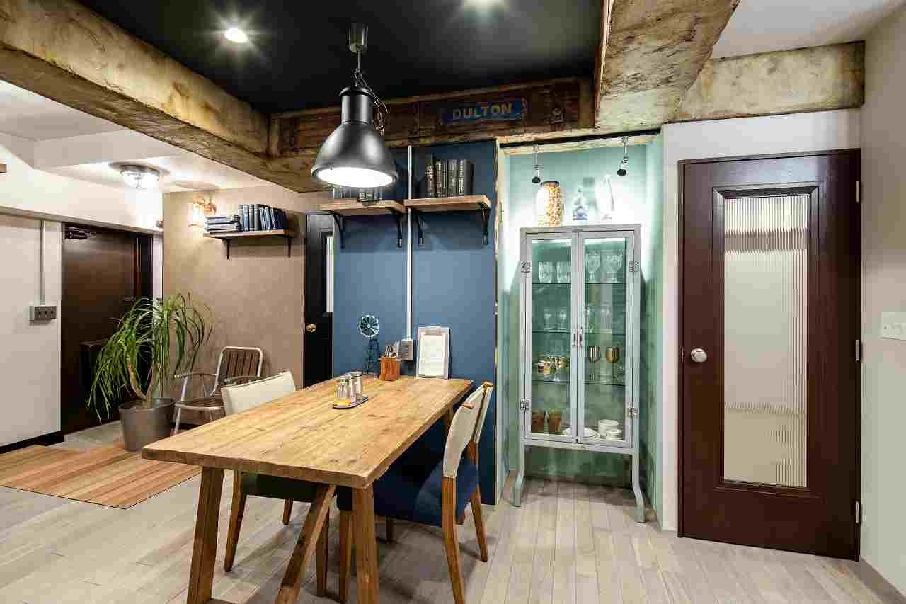 リビングはオリジナルフローリングやブラウンのブラインドをベースに、インパクトのあるダルトンのスチール家具とも相性が良く、図書館のように落ち着いた内装です。エッジを効かせたグリーンやブルーを壁に使うことで、前面ガラスのキャビネットがより映えます。煉瓦を模した立体感のあるモルタル造形の壁や梁がアクセントです。また、足場板とダルトンの黒のアイアン金具を活用した本棚を壁面につくり、部屋のどこにいても趣味の本が目に入ります。