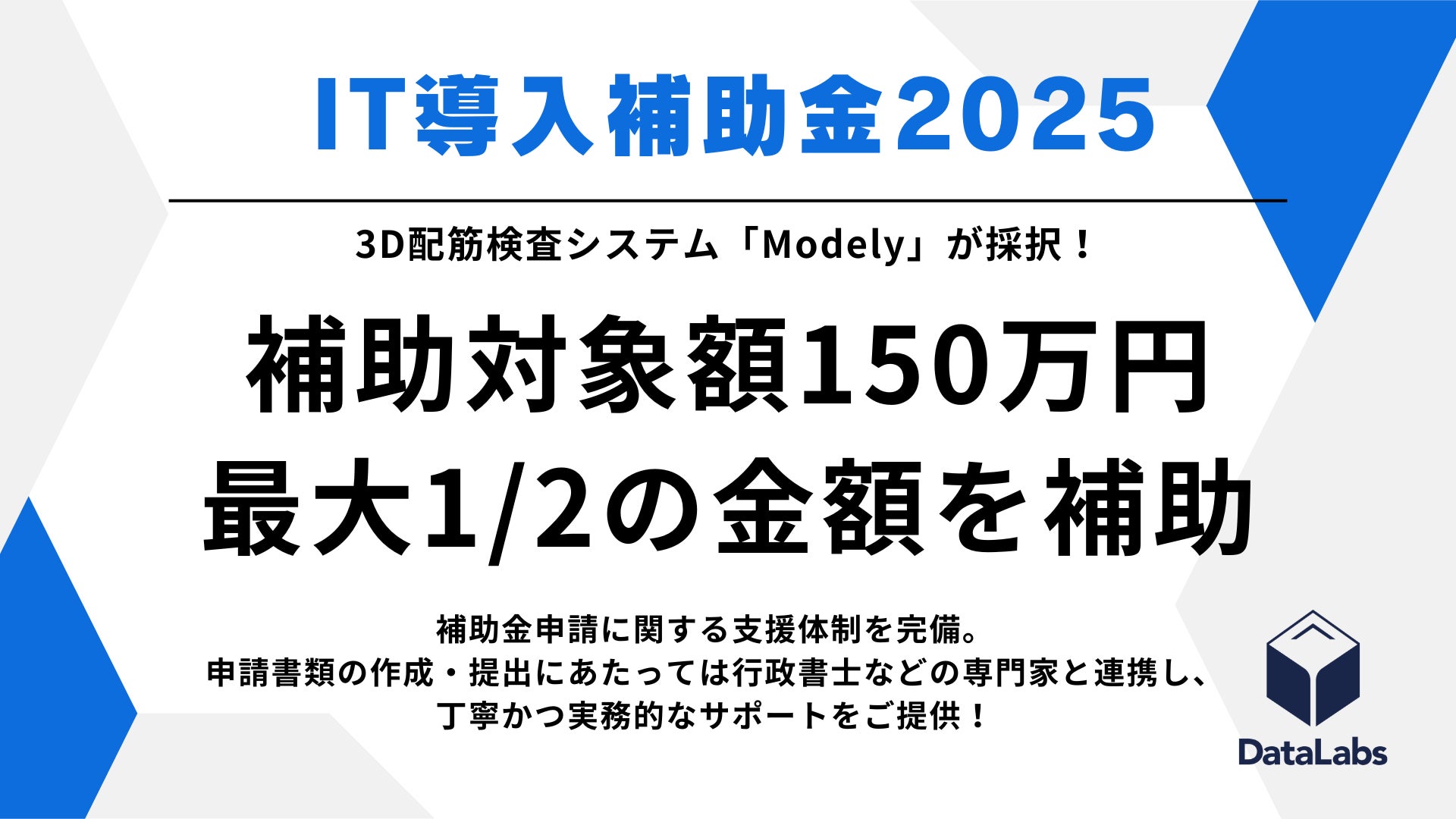 DataLabs株式会社(本社:東京都中央区、代表取締役:田尻 大介、以下「DataLabs」)が開発・提供する3D配筋検査システム「Modely」が、2025年度「IT導入補助金」において補助対象ITツールとして採択されました。あわせて、DataLabsはIT導入支援事業者にも認定されましたので、お知らせいたします。