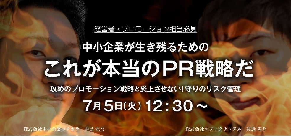 中小企業支援(ブランディング、WEB マーケティング、SDGs支援)事業を行う株式会社中小企業のチカラ(本社:東京都渋谷区、代表取締役社長:山下 佳介、以下「中小企業のチカラ」)( https://nippon-smes-project.com/ )は、MEOを活用した店舗の集客支援サービスを行う株式会社エフェクチュアル(本社:東京都港区、代表取締役:田中 倫明)と共に、「中小企業が生き残るための”攻めのプロモーション戦略”と”炎上させない!守りのリスク管理”」をテーマに無料ウェビナーを開催いたします。