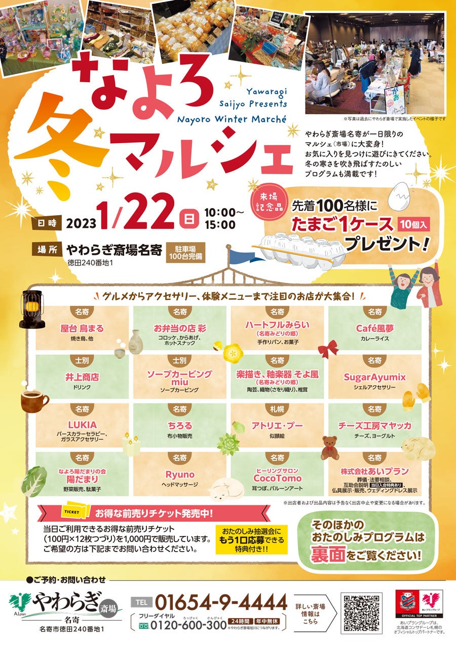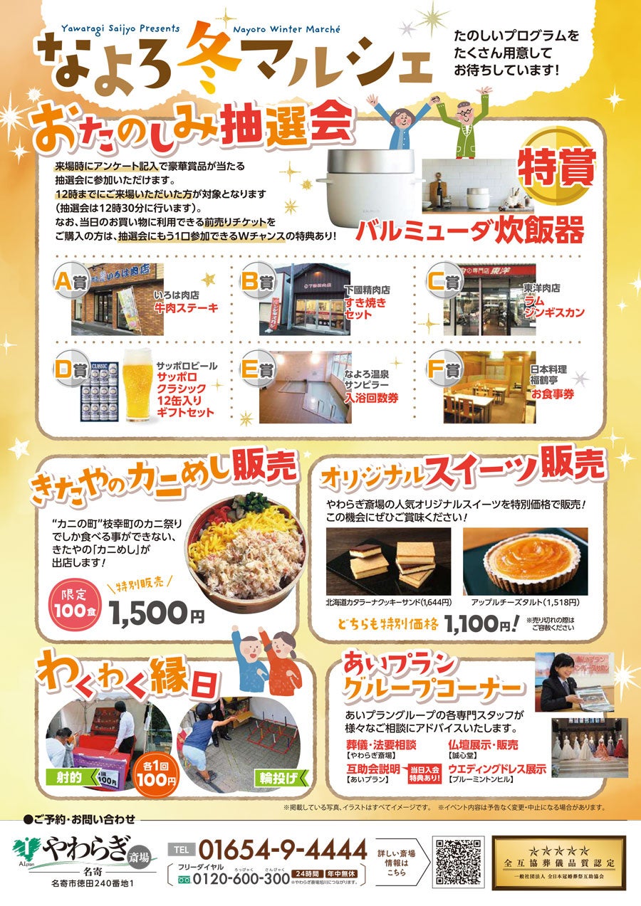 やわらぎ斎場名寄で『なよろ冬マルシェ』を1月22日(日)に開催します。グルメからアクセサリー、体験メニューまで様々なお店が大集合!さらに、抽選会やかに飯、スイーツ販売なども。入場無料・予約不要