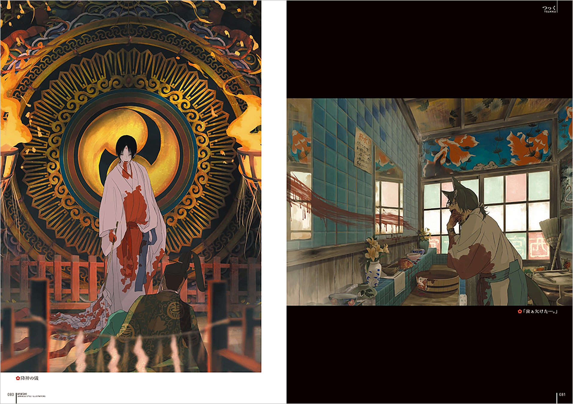 和風ファンタジーを想起させるような「神様」「妖怪」などのキャラクター描写、懐かしさや親しみを覚える幻想的な風景やモチーフの数々、緻密な描写で描かれた壮大な世界観、日本の伝統色を意識した艶やかな彩色……。
