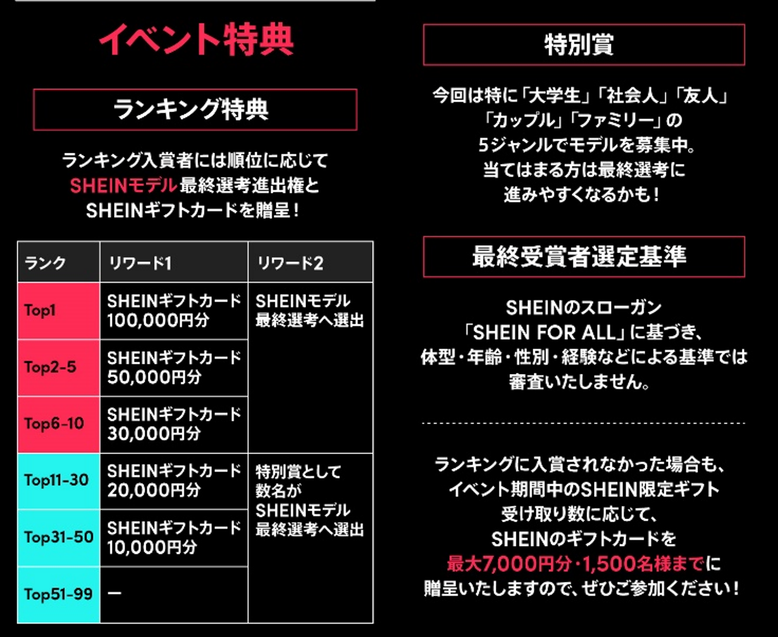 本イベントは、2022年10月13日(木)12:00~2022年10月19日(水)24:00のエントリー期間と、2022年10月21日(金)12:00~2022年10月30日(日)24:00にてイベント実施期間を設けております。エントリーいただいた参加者の皆様は、イベント実施期間中にTikTok LIVE及びショートムービーを活用して獲得できるポイント数より順位が決まり、そのうちのランキング上位10組と特別賞として選ばれた数組が最終選考に選出されます。(最終選考については審査通過者のみに発表いたします。)最終的に8組がSHEINモデルとして選出されます。見事SHEINモデルに輝いた8組には、LOOKBOOK、屋外広告、雑誌、ファッションショーへの出演チャンスがプレゼントされます。ランキングに入賞されなかった場合も、イベント期間中のSHEIN限定ギフト受け取り数に応じて、SHEINギフトカードを最大7000円分、1,500名様までに贈呈いたします。