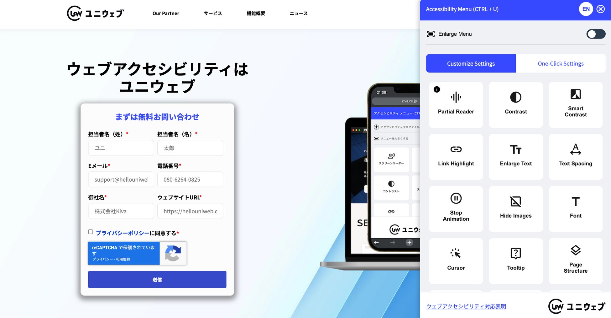 ユニウェブは、すべてのウェブサービスにコード一行を追加するだけで「導入当日」にウェブアクセシビリティ機能をサポートします。
