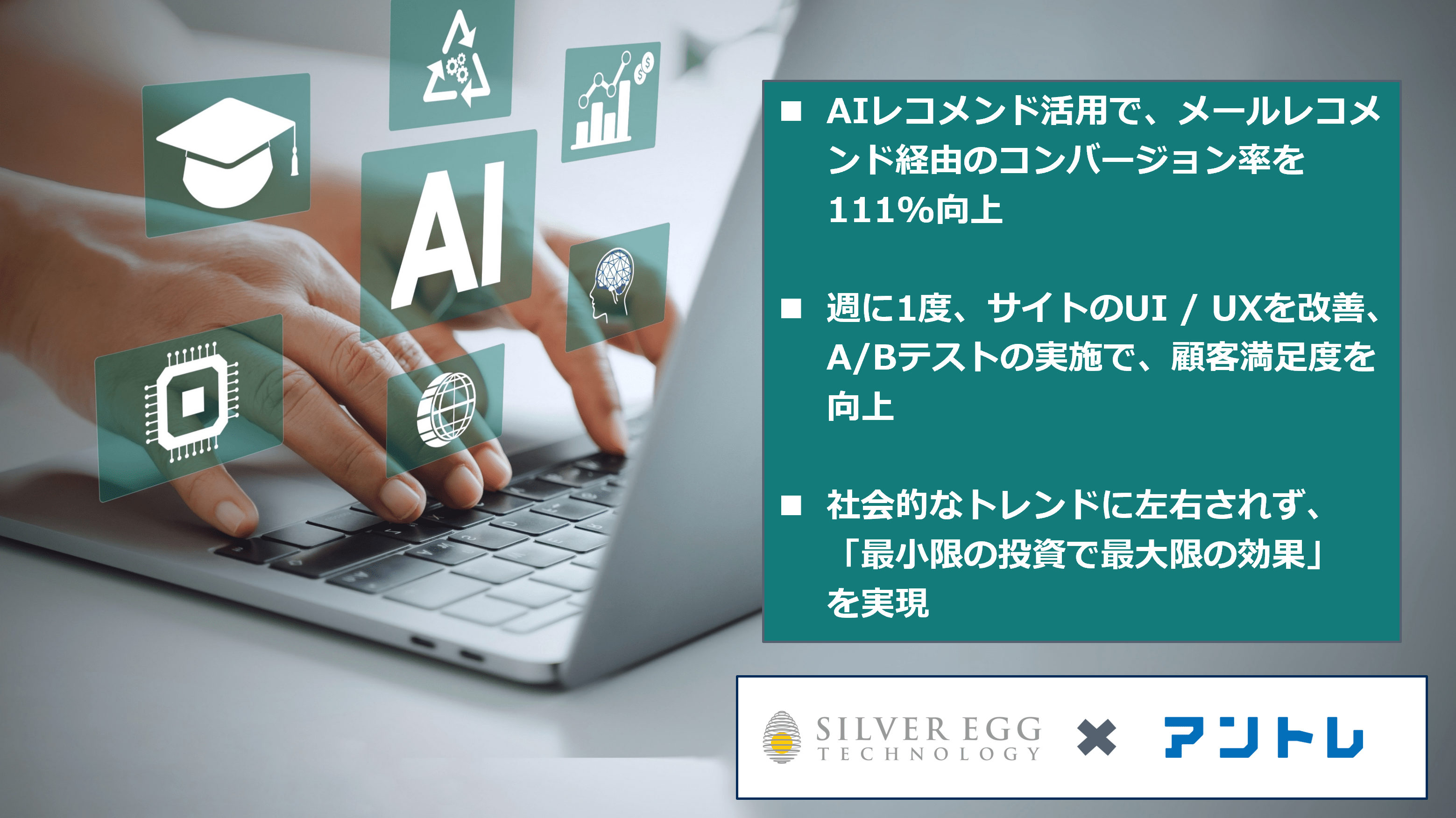 シルバーエッグ・テクノロジー株式会社(本社:大阪府吹田市、代表取締役社長&CEO:トーマス・フォーリー、証券コード 3961、以下 シルバーエッグ)は、同社が開発・提供するAI技術を用いた「アイジェント・レコメンダー」および「レコガゾウ」を採用した株式会社アントレ(本社:東京都港区、代表取締役:上田 隆志、以下 アントレ)が運営する独立、開業、フランチャイズ募集の情報サイト「アントレ」(https://entrenet.jp/)において、リアルタイム・レコメンドメールサービス「レコガゾウ」によるレコメンドメール経由のコンバージョンが111%向上したことを確認しましたので、これをお知らせいたします。