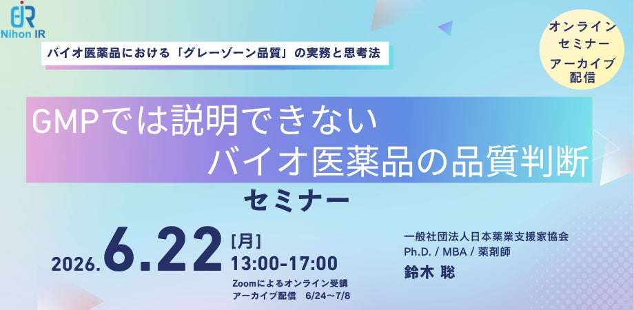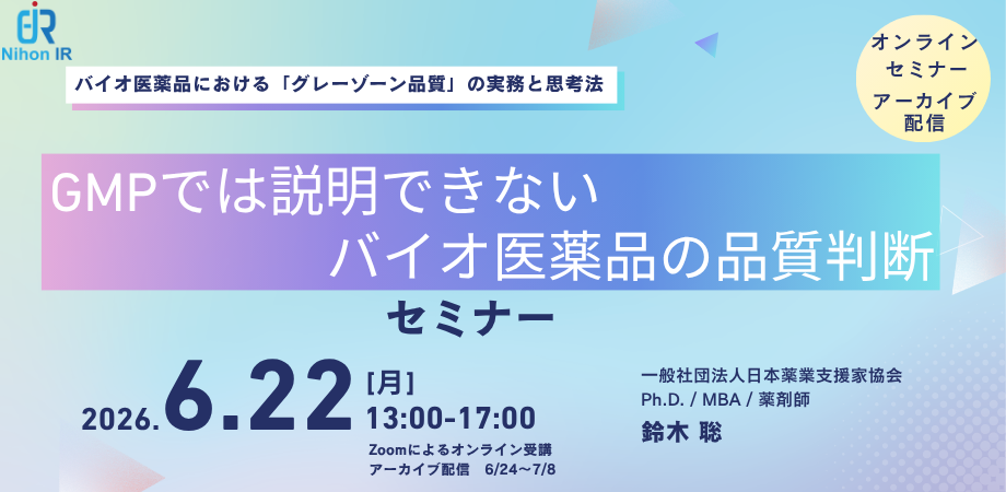 アイアール技術者教育研究所は、抗体医薬品や再生医療等製品、核酸医薬品などバイオ医薬品の品質判断で生じやすい「規格や手順だけでは白黒つかない」グレーゾーン品質に向き合うため、科学的に正しい説明と規制当局に納得される説明の違い、GMP文書とCTD(Module 3)の関係性、会社としての判断と説明責任の整理を体系的に学べる公開セミナーを開催します。