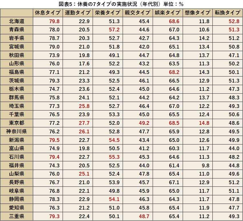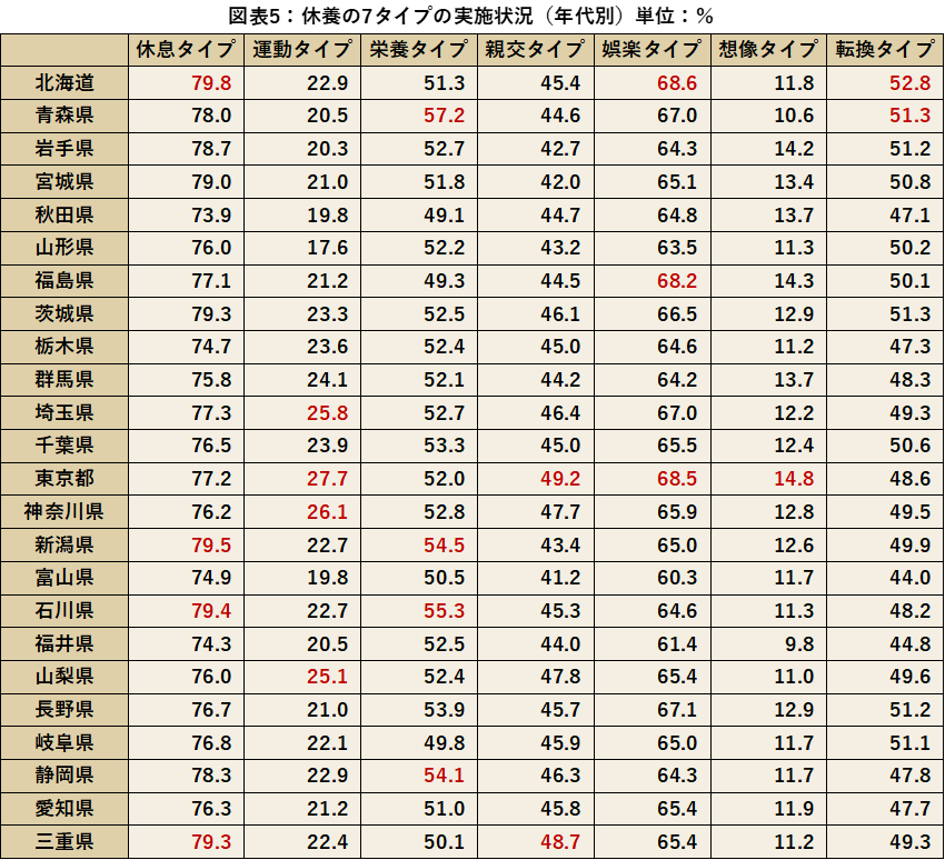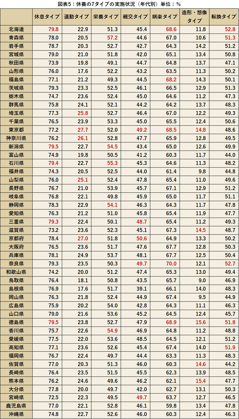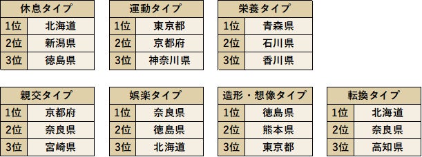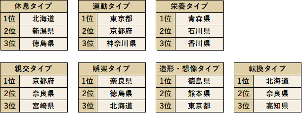 休養の7タイプの実施状況を都道府県別に比較していきます。休息タイプの実施率1位は北海道、運動タイプは東京都、栄養タイプは青森県、親交タイプは京都府、娯楽タイプは奈良県、造形・想像タイプは徳島県、展開タイプは北海道、という結果となりました。