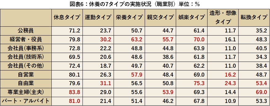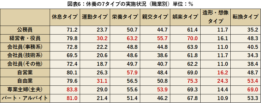 休養の7タイプの実施状況を職業別に比較していくと、休息タイプで最も高いのは専業主婦(主夫)83.8%、パート・アルバイト81.0%、運動タイプは自由業31.1%、経営者・役員30.2%、栄養タイプは経営者・役員63.2%、自営業57.9%、親交タイプは経営者・役員55.7%、専業主婦(主夫)53.9%、娯楽タイプは自由業75.3%、経営者・役員70.0%、造形・想像タイプは自由業24.3%、自営業16.2%、転換タイプは専業主婦(主夫)69.0%、自由業53.4%という結果となりました。