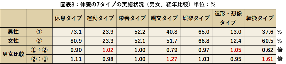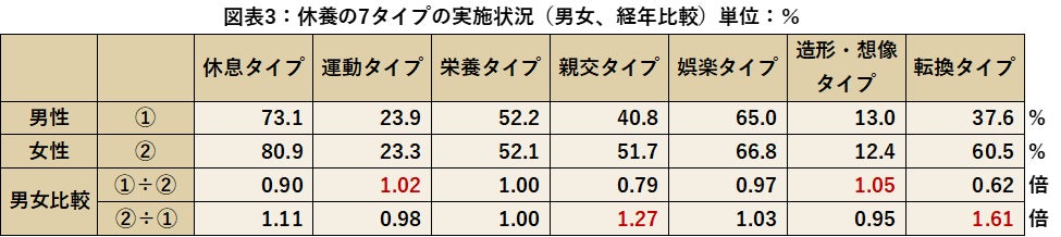 男女別で休養の7タイプの実施状況を比較していくと、男性で最も多いのが休息タイプ73.1%、次いで娯楽タイプ65.0%、女性も同様で最も高いのが休息タイプ80.9%、次いで娯楽タイプ39.4%となりました。男女で比較すると男性の実施率が高いものは造形・想像タイプ1.05倍、運動タイプ1.02倍、女性の実施率が高いものは転換タイプ1.61倍、親交タイプ1.27倍という結果となりました。男性の方が運動や造形など体を動かす傾向に、女性は親交や転換でコミュニケーションや外出などのリフレッシュが多い傾向となりました。