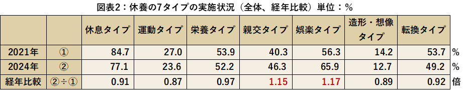 2021年の実践状況と比較すると、最も減少したのは運動タイプ0.87倍、次いで造形・想像タイプ0.89倍、休息タイプ0.91倍、増加したのは娯楽タイプ1.17倍、親交タイプ1.15倍という結果となりました。様々な休養タイプを実践し、休養方法の多角化が見られる結果となりました。