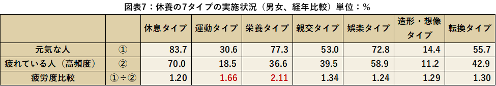 休養の7タイプの実施状況を疲労度合別で比較すると、どの項目においても疲れている人(高頻度)よりも元気な人の方が、実施率が上回る結果となりました。特に栄養タイプでは2.11倍、運動タイプでは1.66倍という結果となりました。